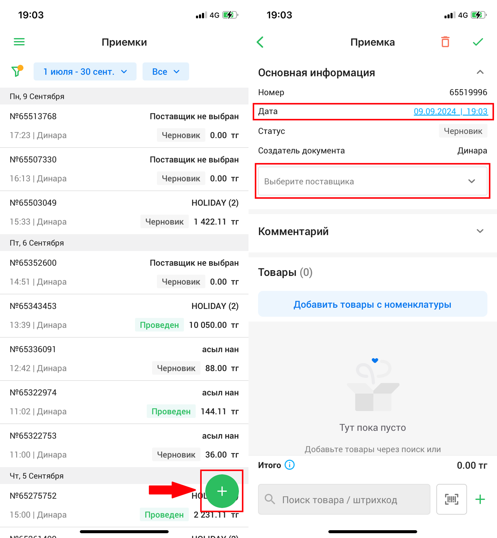 Нажмите на кнопку “➕” в правом нижнем углу экрана, чтобы создать приемку. Откроется страница “Создание приемки”. Создастся приемка со статусом “Черновик”. Для того, чтобы провести приемку, необходимо указать дату приемки и поставщика и, при необходимости, добавляем комментарий.