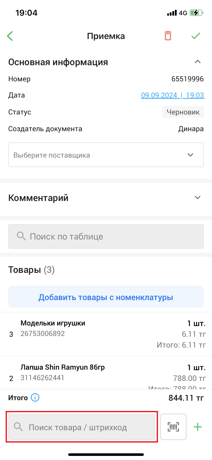 Воспользуйтесь полями “Добавление товара - поиск по названию, штрихкод” для того, чтобы добавить товар с помощью поиска по названию/штрихкоду.