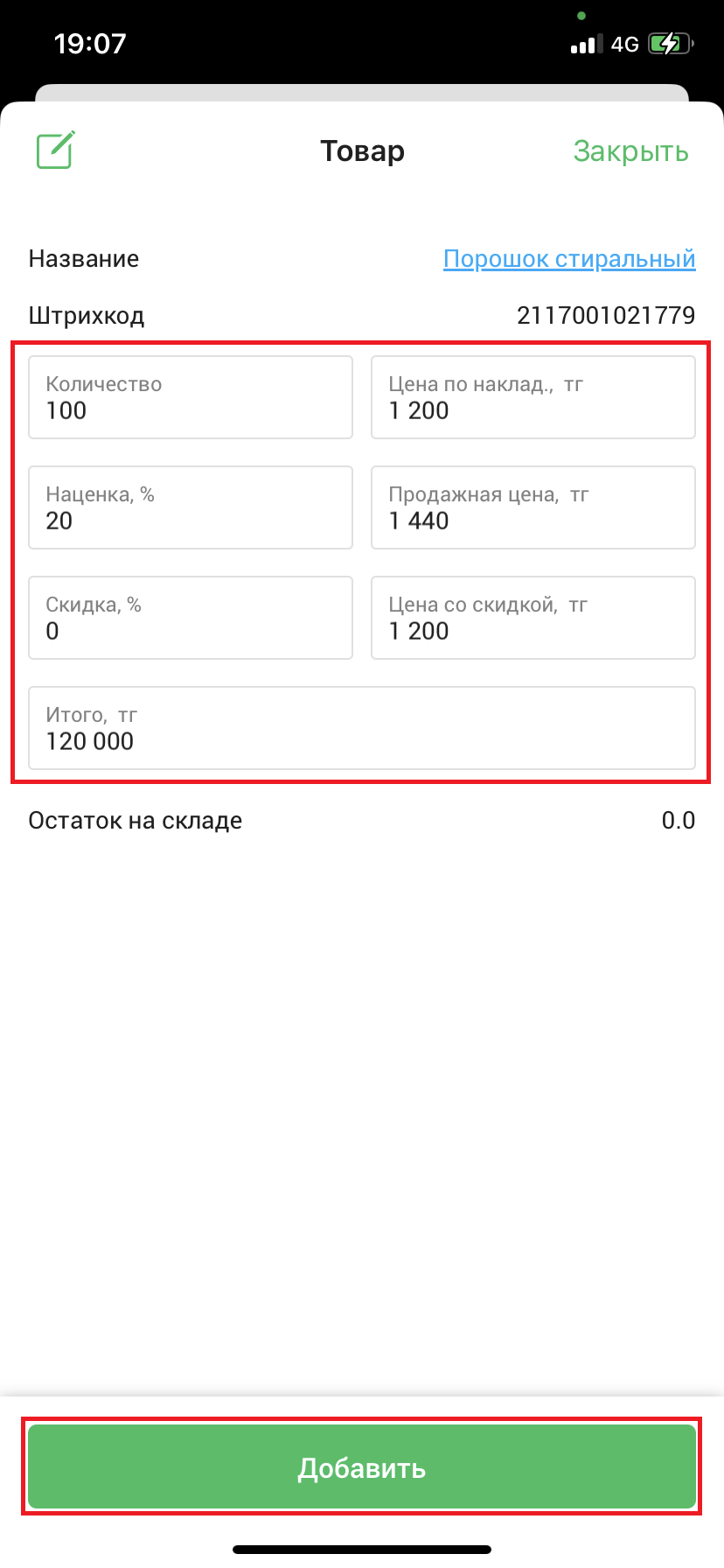 Откроется окно “Добавление товара”. Укажите актуальное количество товара и цены, затем нажмите на кнопку “Добавить”, чтобы добавить созданный товар в приемку.