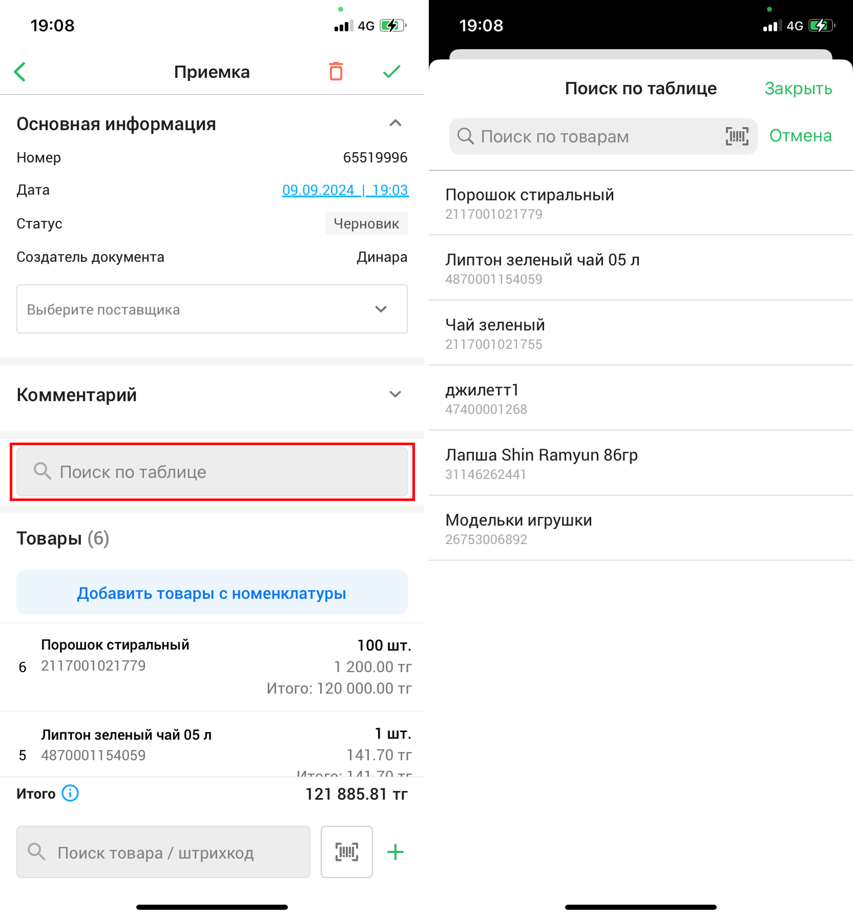Воспользуйтесь поиском по таблице, чтобы провести поиск товара, добавленного в документ приемки.