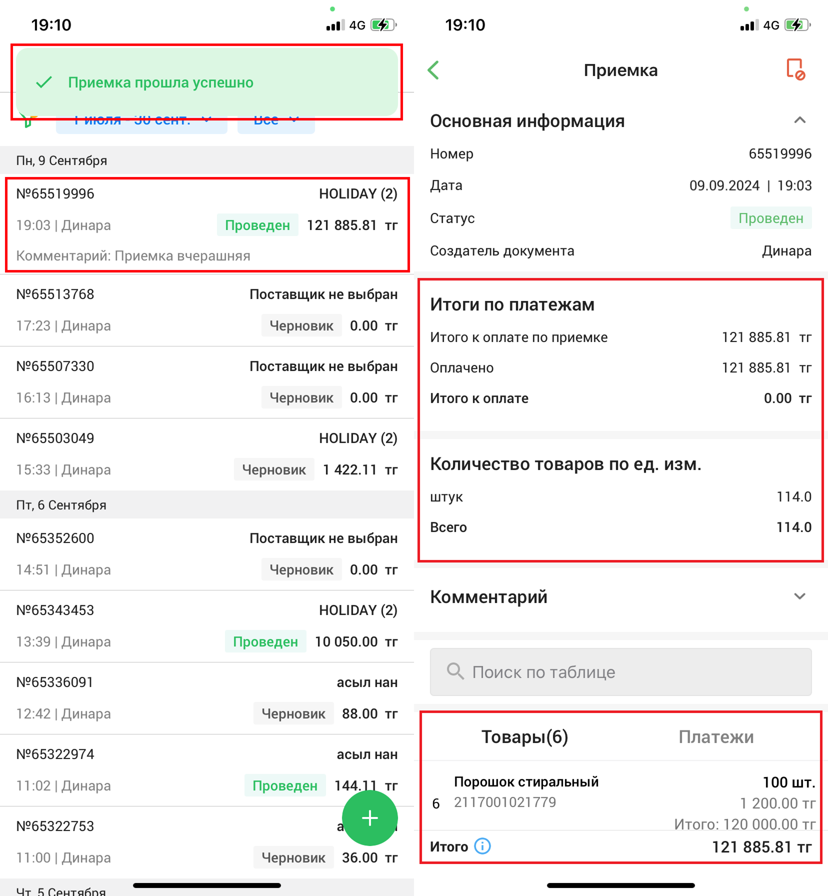 При успешном создании приемки вы увидите уведомление “✅ Приемка отправлена на проведение” в правом верхнем углу экрана и сам документ приемки в списке. Остаток неоплаченной суммы приемки, проведенной под консигнацию, помечается красным цветом в списке в столбце “Осталось”.