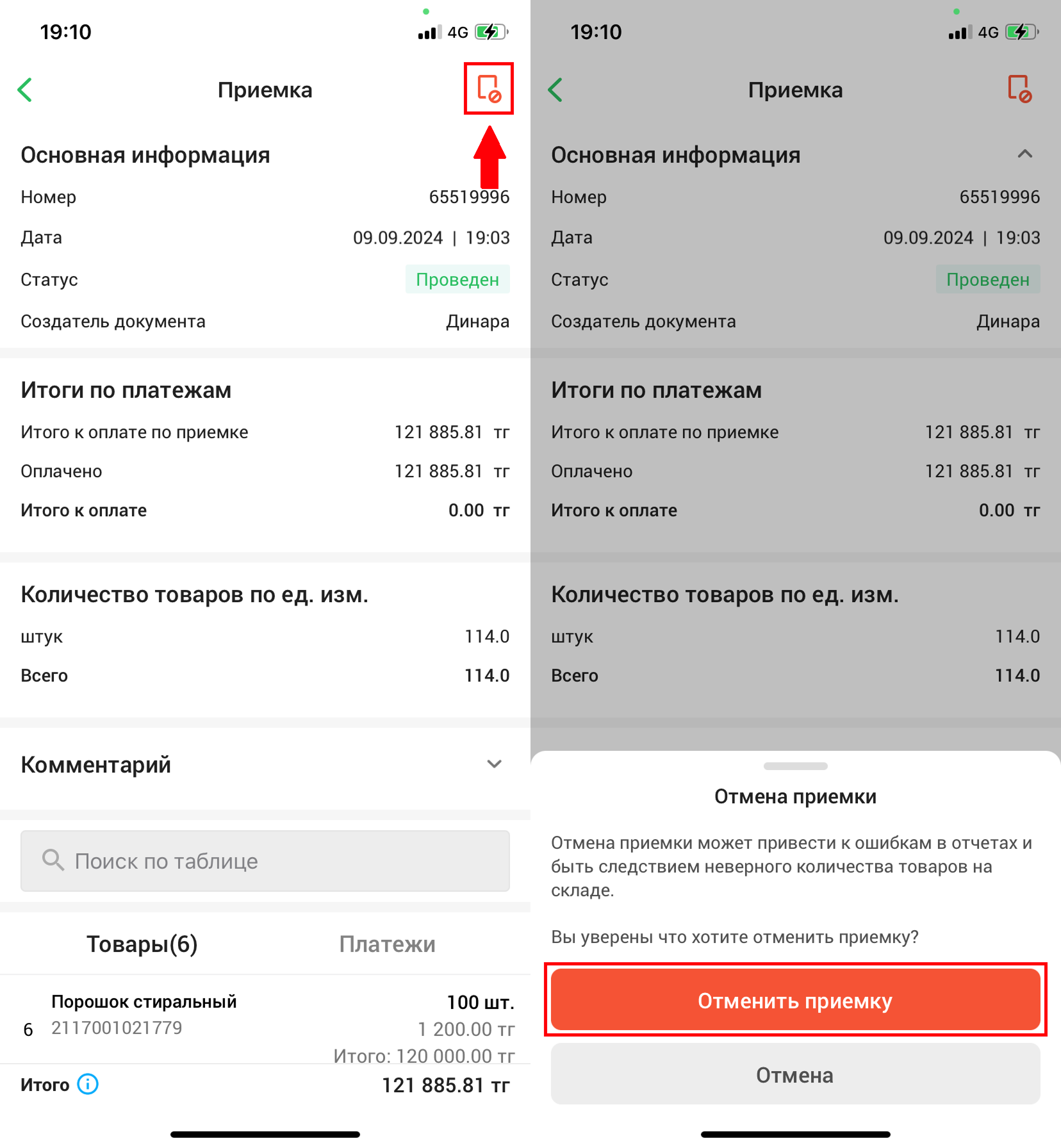 Откроется проведенный документ приемки с подробной информацией о приемке. Нажмите на кнопку “Отменить приемку” в правом верхнем углу экрана.