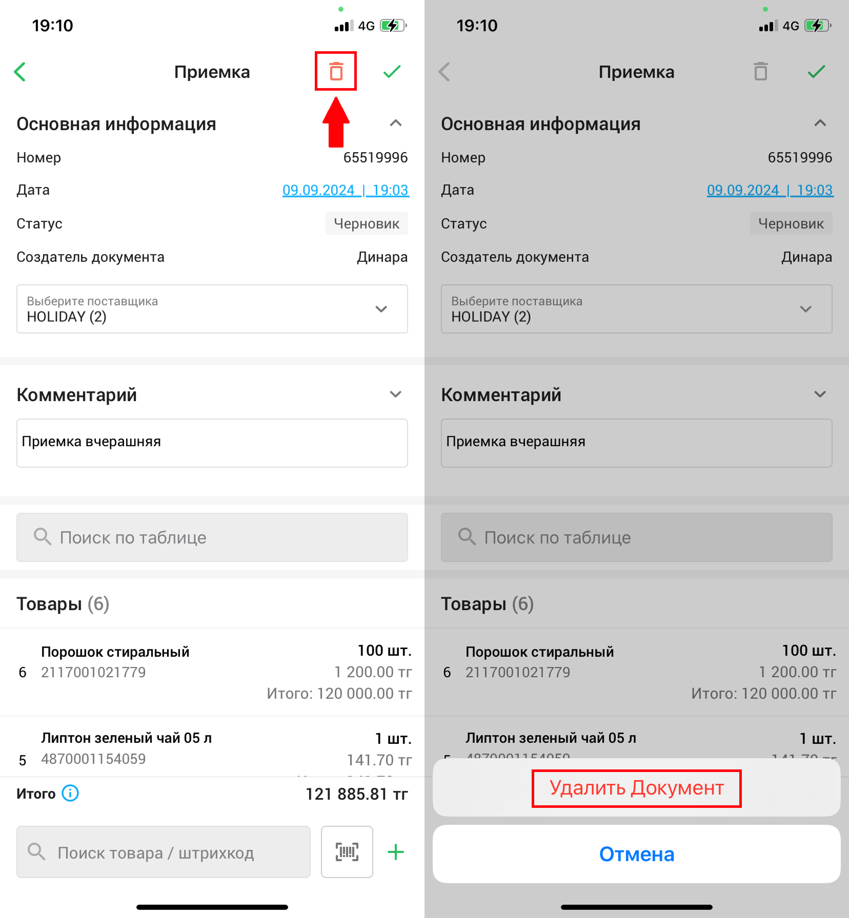 Нажмите на кнопку “🗑️” в правом верхнем углу экрана, чтобы удалить приемку, затем, подтвердите удаление приемки в открывшемся окне, нажав на кнопку “Удалить документ”.