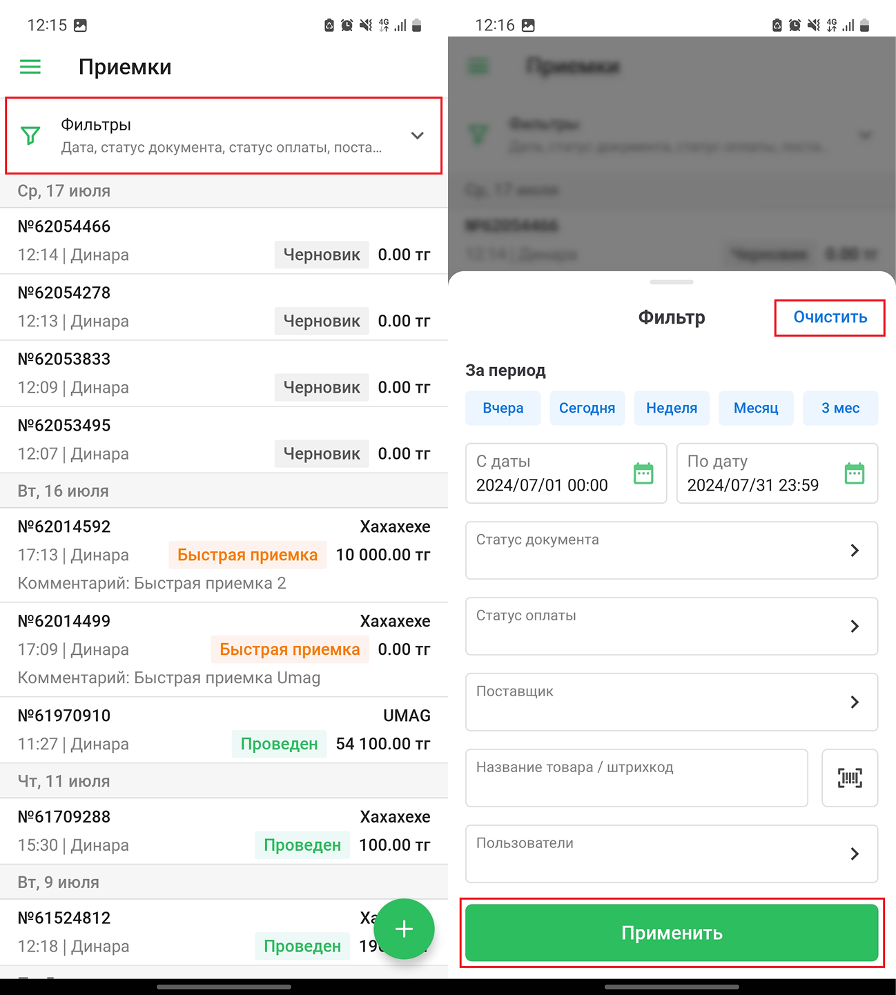 Нажмите на поле фильтра в верхней части экрана, чтобы воспользоваться фильтрацией. Откроется страница “Фильтры”. Вы можете настроить фильтр по дате, статусу документа, статусу оплаты, поставщику, пользователю и названию/штрихкоду товара. Настройте параметры фильтрации и нажмите на кнопку “Применить”, чтобы применить фильтр, либо нажмите на кнопку “Очистить”, чтобы очистить фильтрацию.