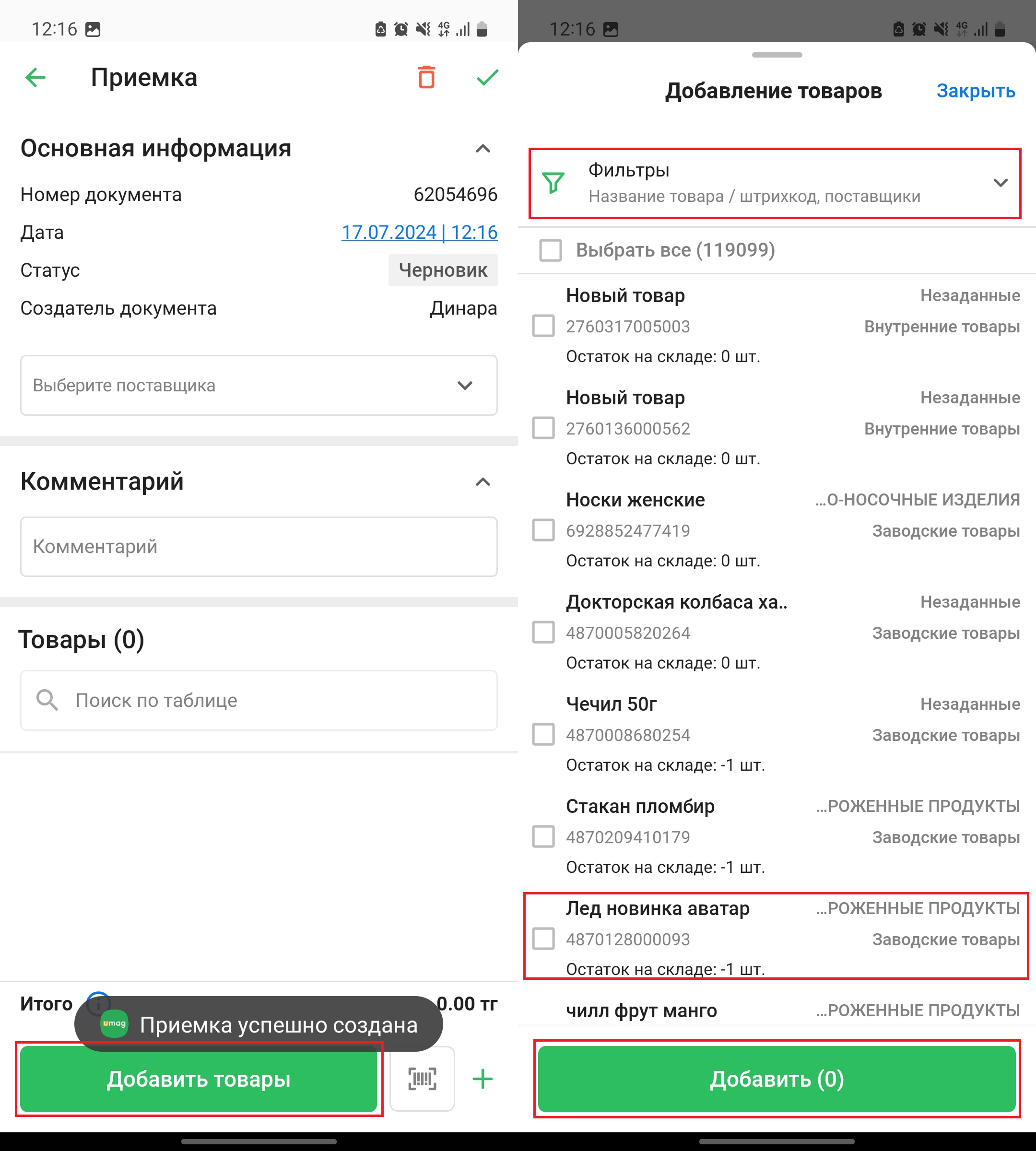 Для того, чтобы добавить товары из номенклатуры, нажмите на кнопку “Добавить товары” в нижней части экрана. Откроется окно “Добавление товаров”. Нажмите на поле “Фильтры”, чтобы настроить фильтр. Нажмите на необходимый вам товар, чтобы добавить его в приемку. Затем, нажмите на кнопку “Добавить”, чтобы добавить выбранные товары в приемку.