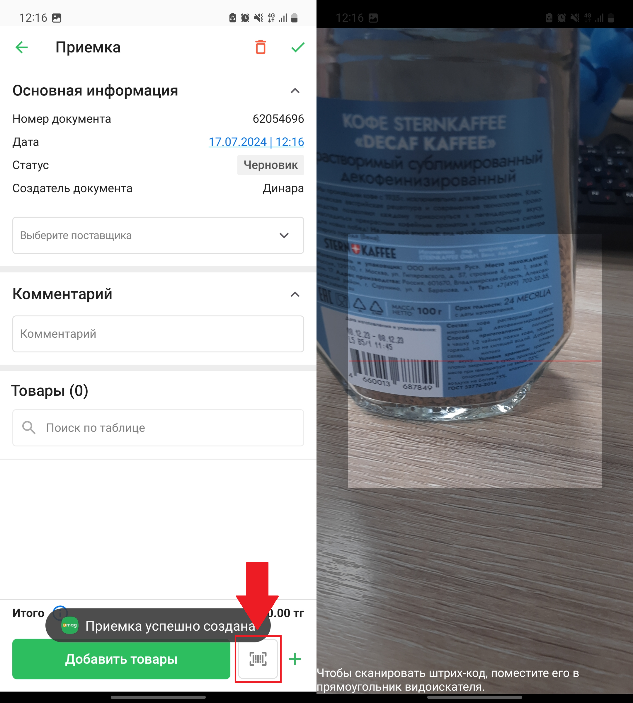 Для того, чтобы добавить товары с помощью сканирования штрихкода, нажмите на кнопку сканирования штрихкода. Отсканируйте штрихкод товара, чтобы добавить его в приемку.