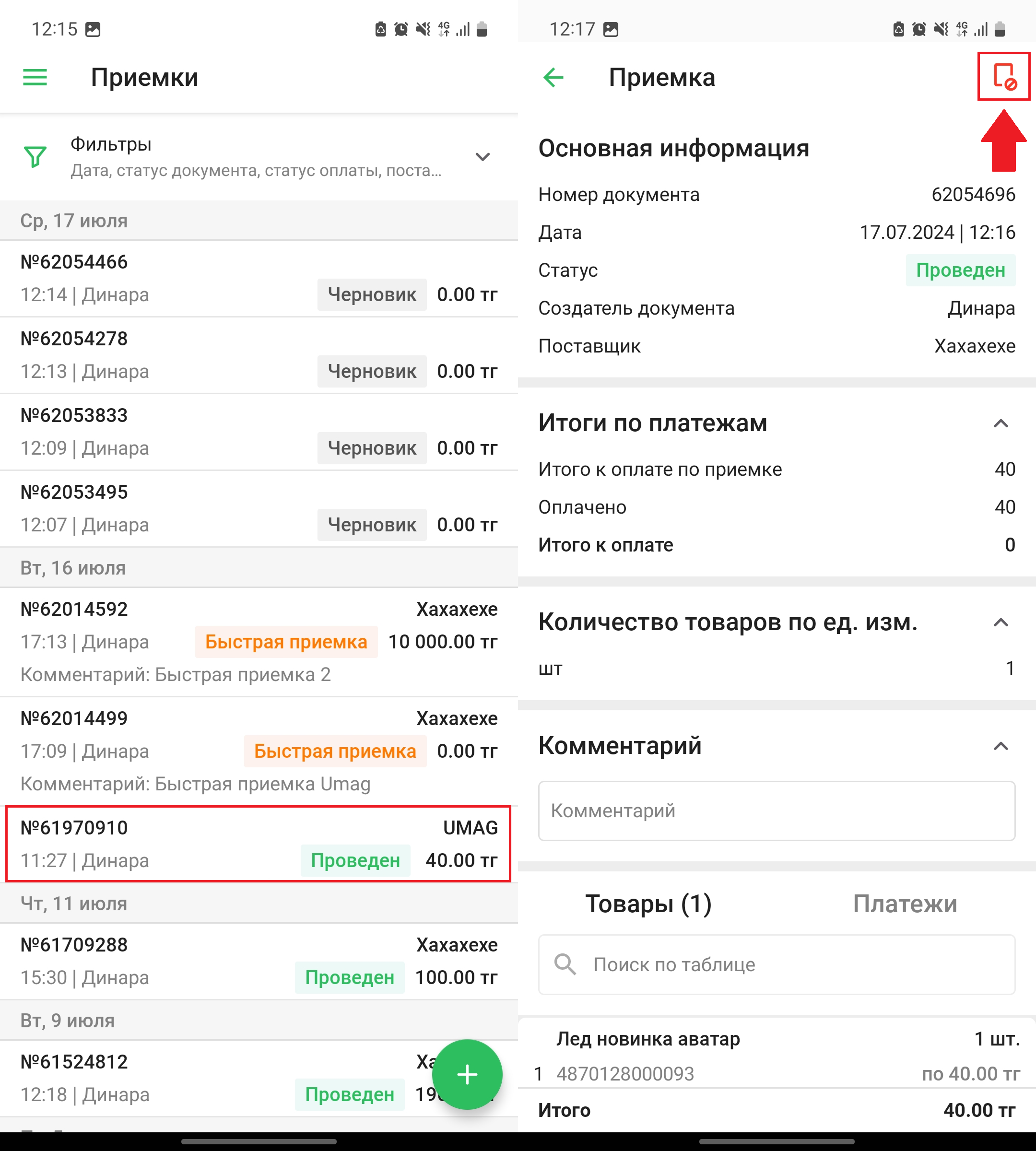 Все добавленные товары вы увидите в списке во вкладке “Товары”. Нажмите на кнопку “✅” в правом верхнем углу экрана, чтобы провести/сохранить приемку. Во всплывающем окне нажмите на кнопку “Провести”, чтобы провести документ приемки, либо нажмите на кнопку “Сохранить”, чтобы сохранить документ приемки как черновик.