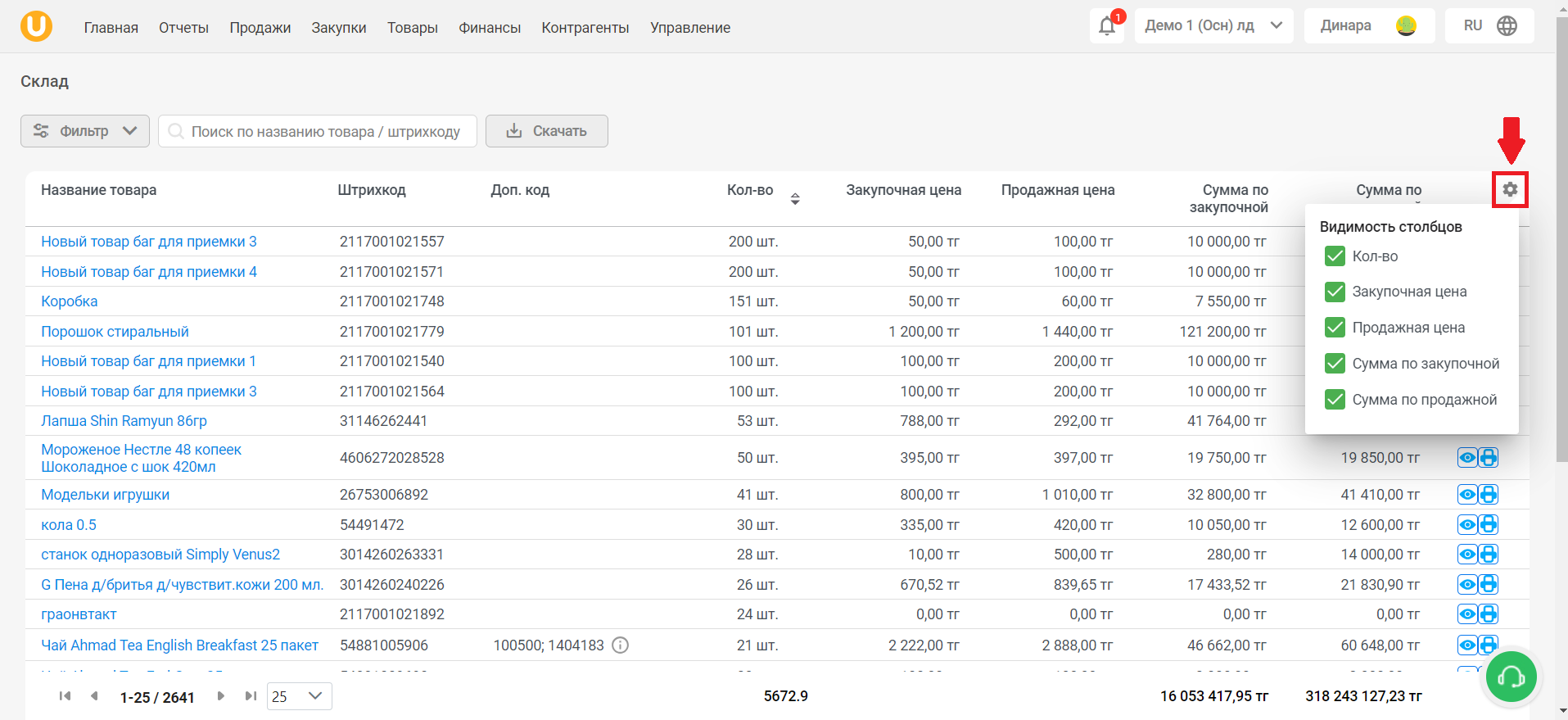 Для того, чтобы редактировать видимость столбцов списка товаров на складе, нажмите на кнопку “⚙️” в правом верхнем углу списка.