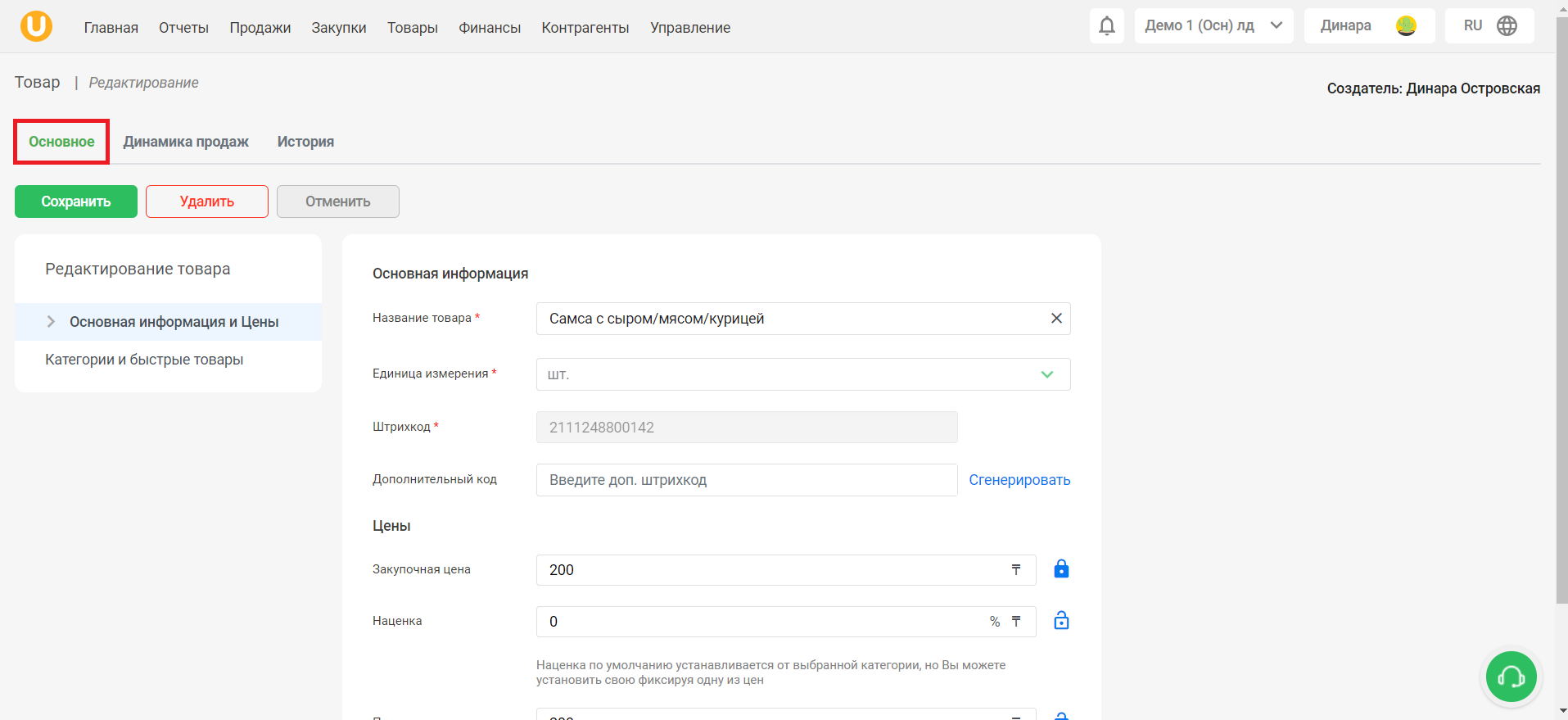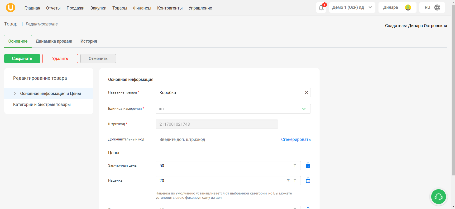 Откроется страница карточки товара в номенклатуре, где вы можете редактировать информацию о выбранном товаре, а также посмотреть историю и динамику продаж товара.