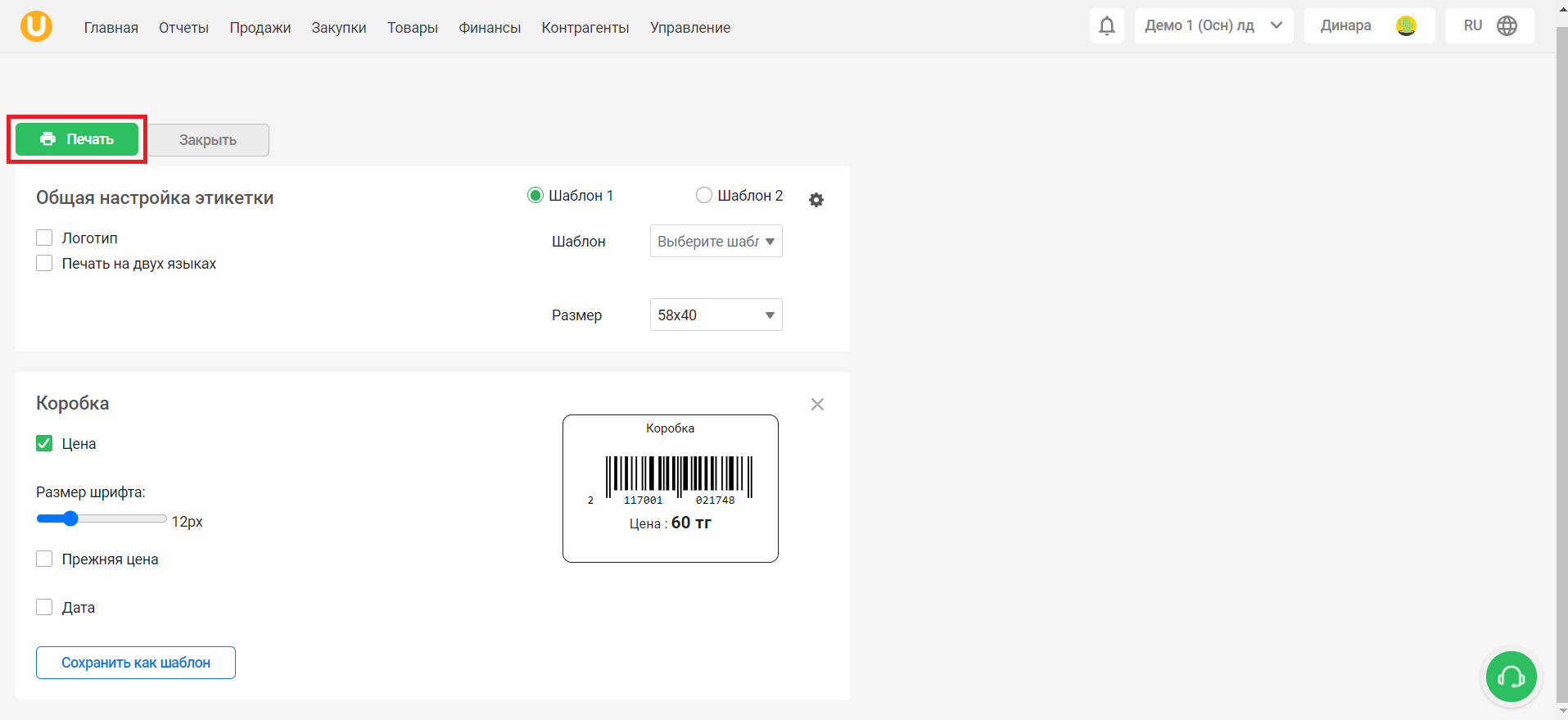 Нажмите на кнопку “🖨️”, чтобы открыть страницу печати этикетки.