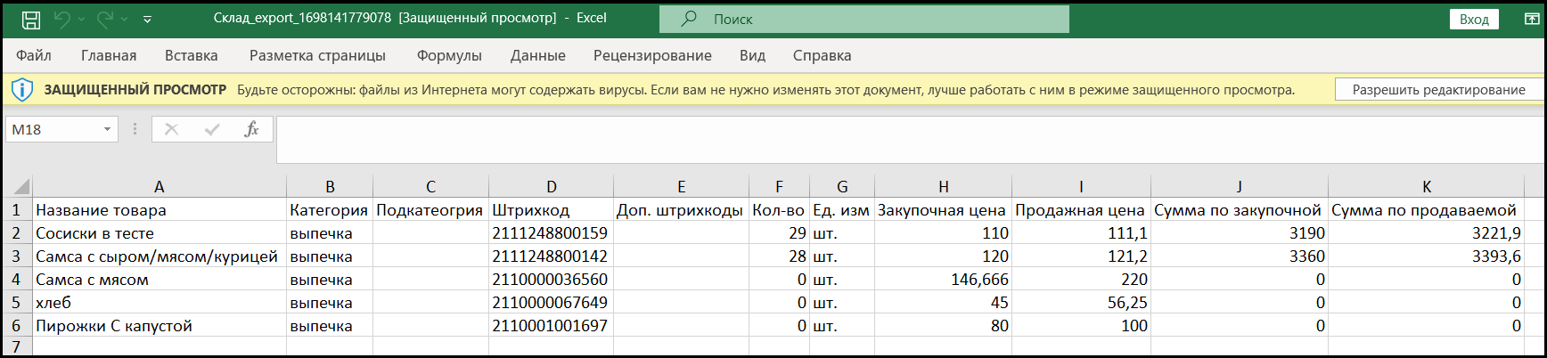 Откроется страница “Склад”. На данной странице вы можете увидеть информацию о товарах с остатком на складе - название, штрихкод, доп. код, количество товара на складе, закупочная, продажная цены и суммы по закупочным и продажным ценам.