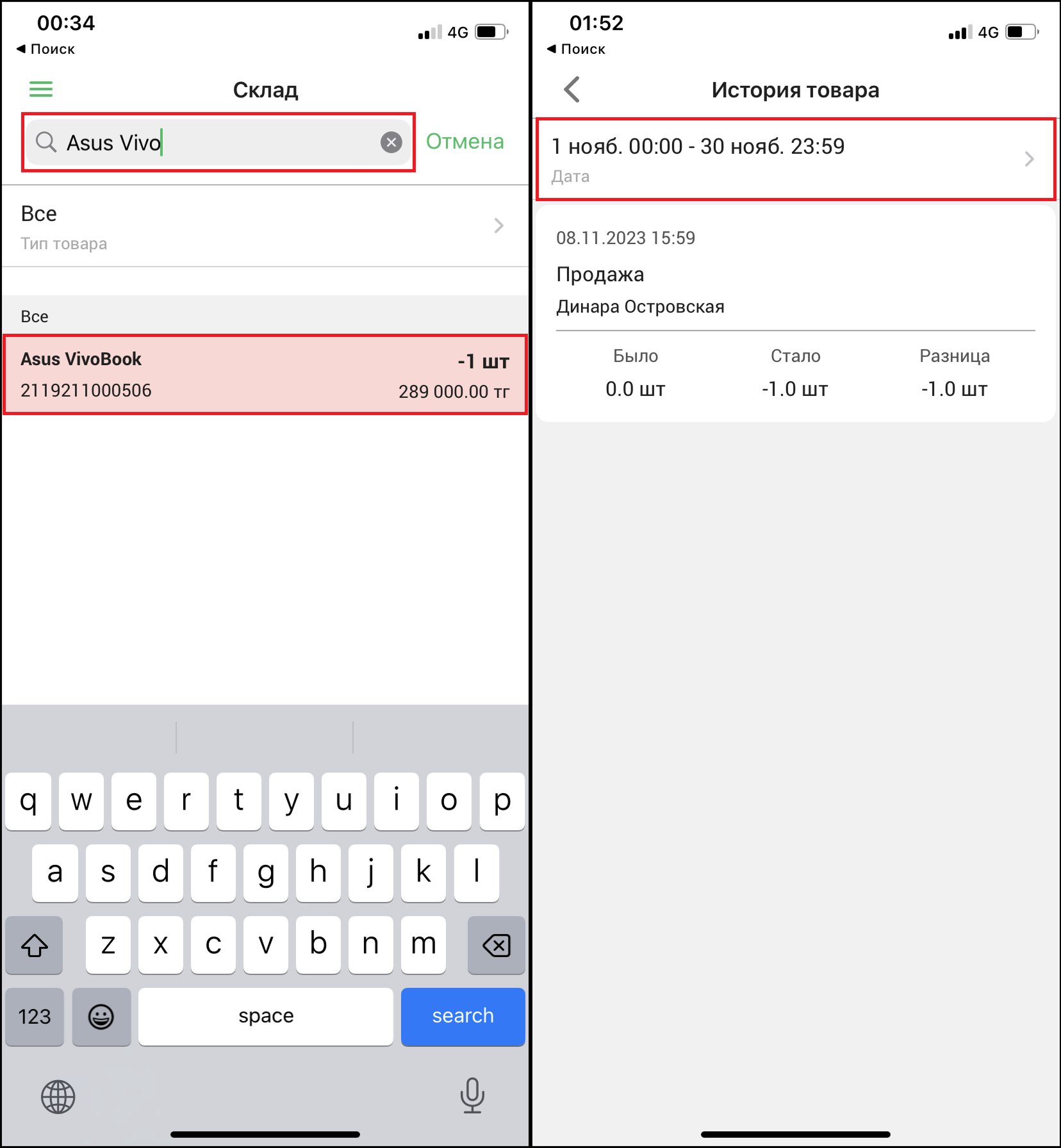 Для того, чтобы произвести поиск товара по названию или штрихкоду, вводите данные в поле “Поиск по названию товара / штрихкоду”. Параметры поиска также отобразятся над списком товаров.