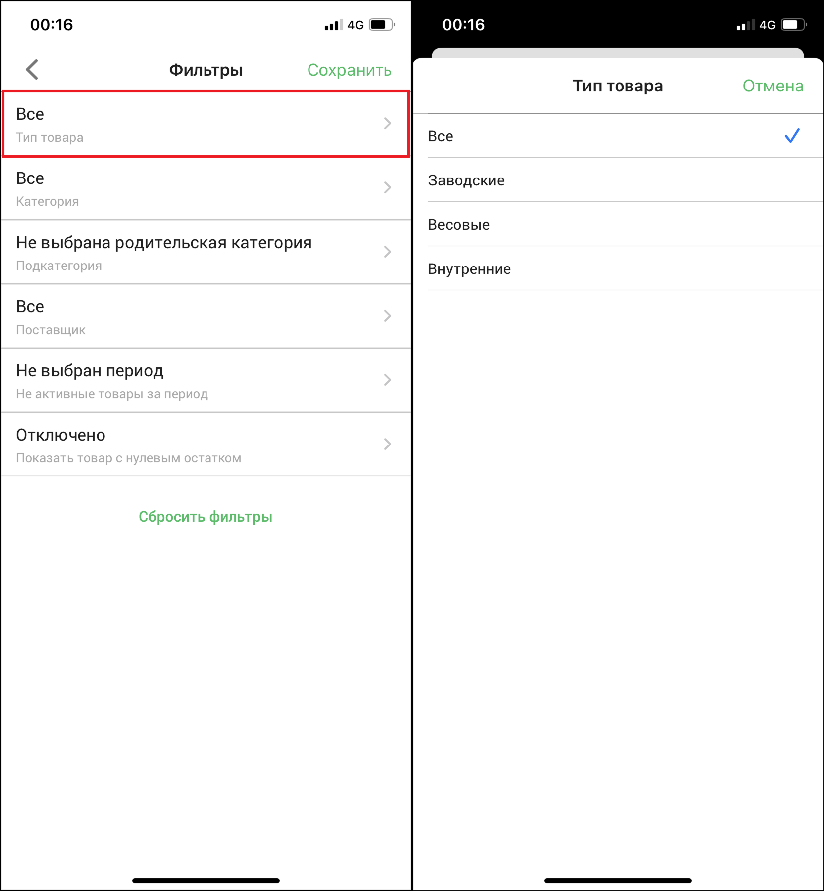 Фильтр упрощает поиск нужных вам товаров на складе. Для того, чтобы воспользоваться фильтром, на странице склада нажмите на кнопку “Тип товара”. Откроется страница “Фильтры”.
