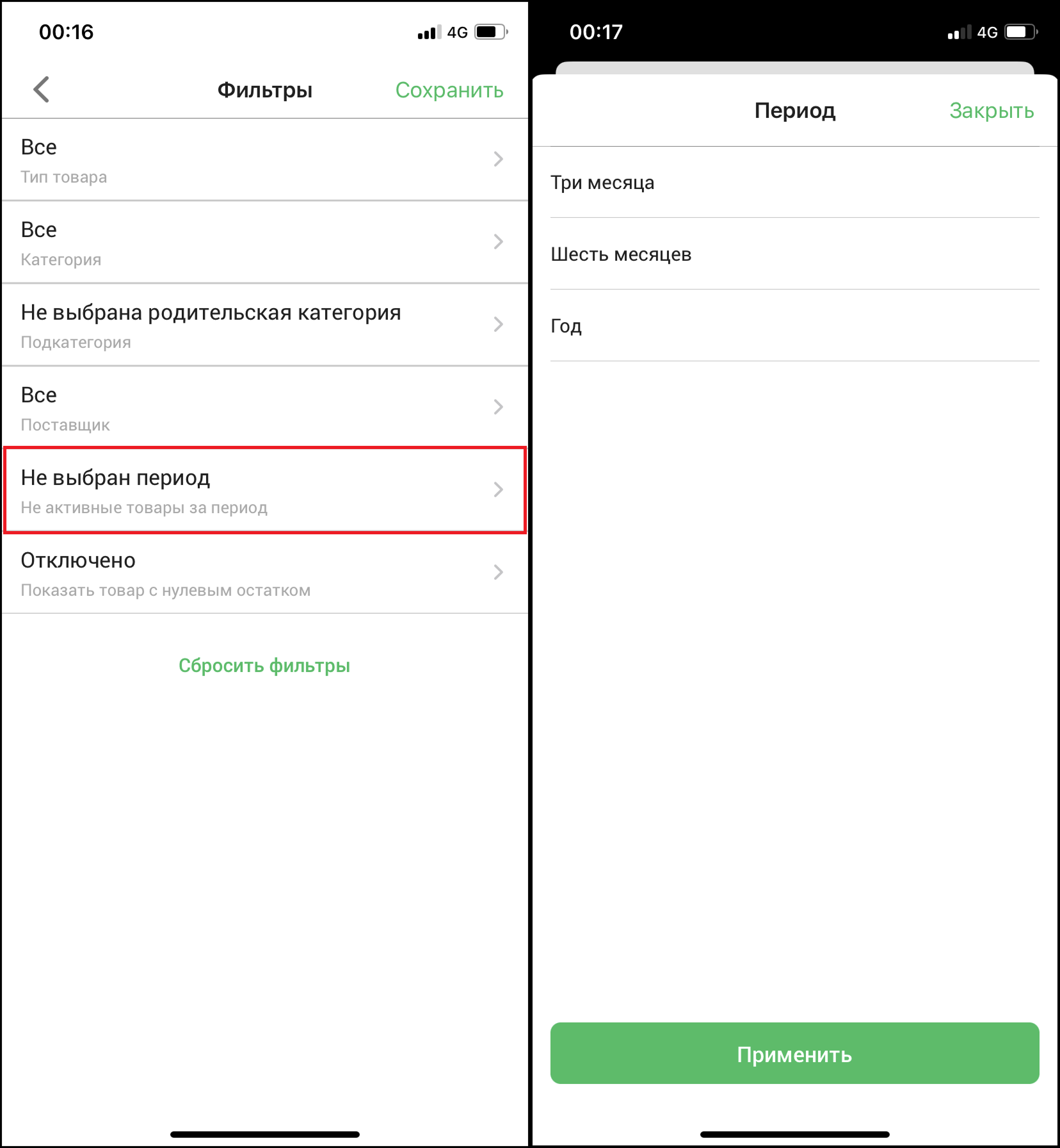 Нажмите на вкладку “Не активные товары за период”, чтобы отредактировать фильтр по неактивным товарам за определенный период.