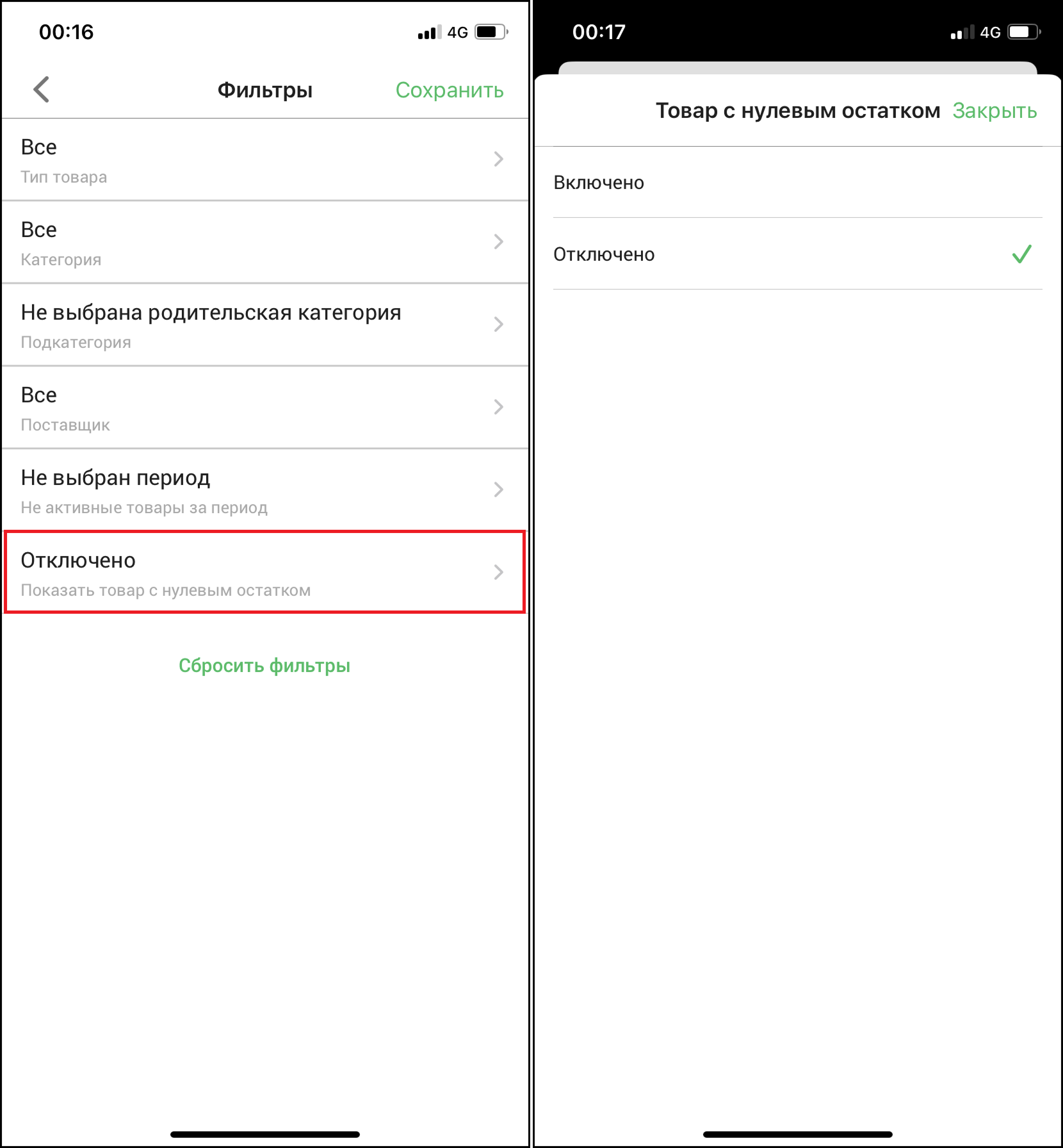 Нажмите на вкладку “Показать товар с нулевым остатком”, чтобы отредактировать фильтр по остаткам товара. Откроется окно “Товар с нулевым остатком”, выберите “Включено” для отображения товаров с нулевым остатком. Выберите “Отключено”, если вы не хотите видеть товары с нулевым остатком.
