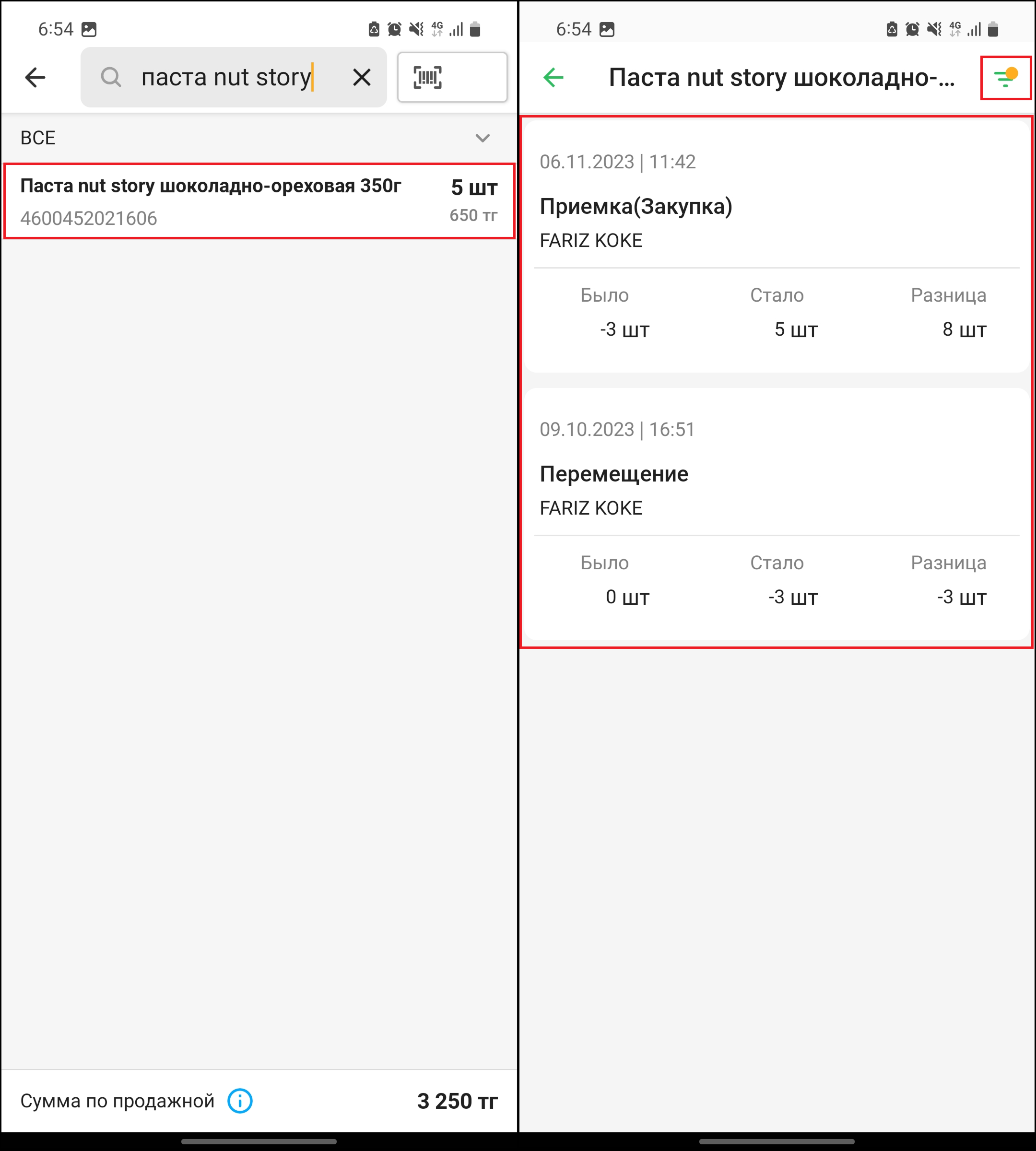 Для того, чтобы посмотреть историю движения продукта, нажмите на кнопку “👁️” справа от наименования в списке.