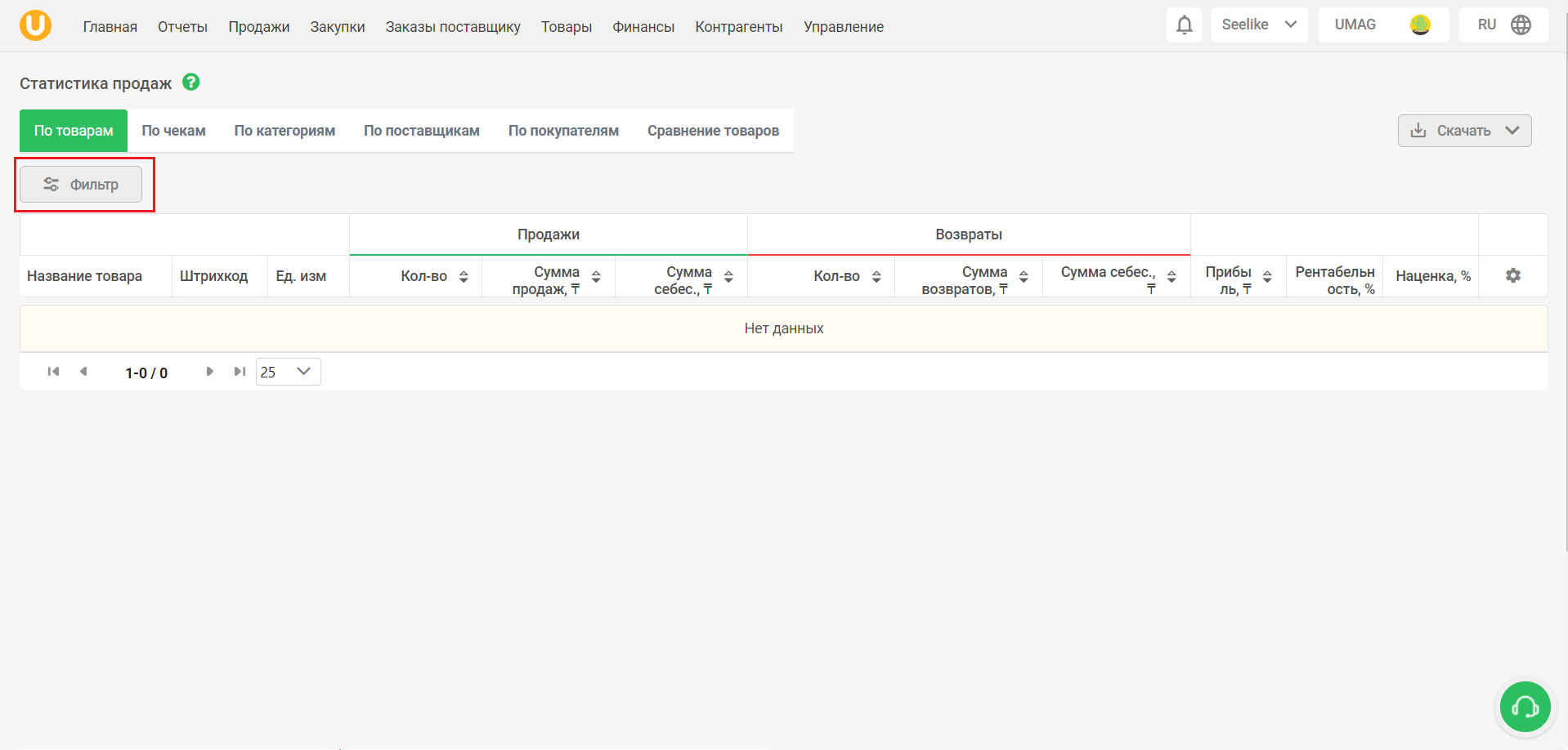 Для перехода на страницу "Статистика продаж" наведите мышь на “Отчеты” в верхнем меню, а затем в выпадающем списке нажмите на "Статистика продаж".