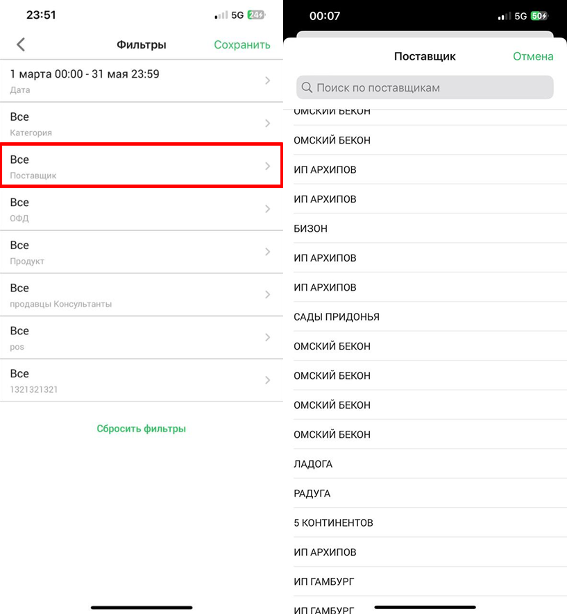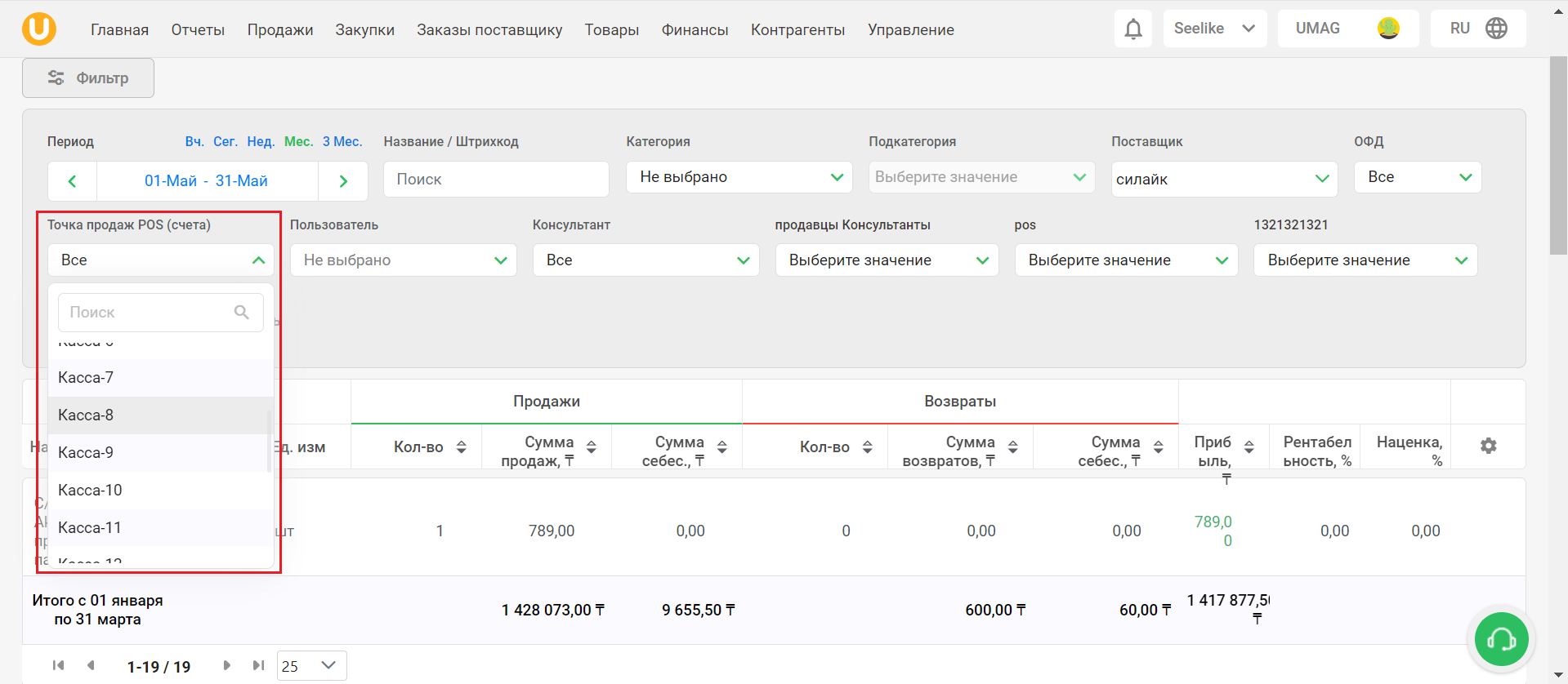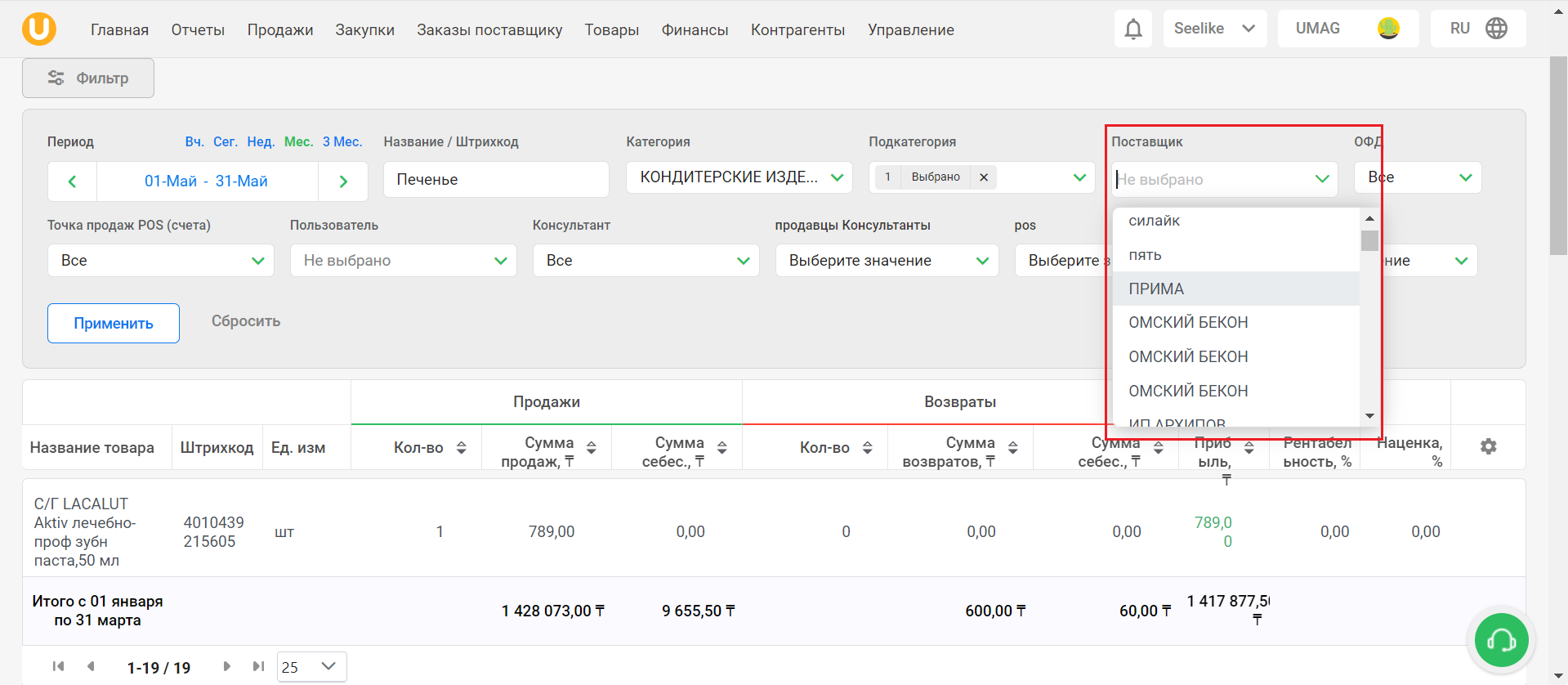 Например, вы можете выбрать определенный период времени, поставщика и точку продажи, чтобы получить информацию о продажах за этот период от этого поставщика в выбранной точке продажи.