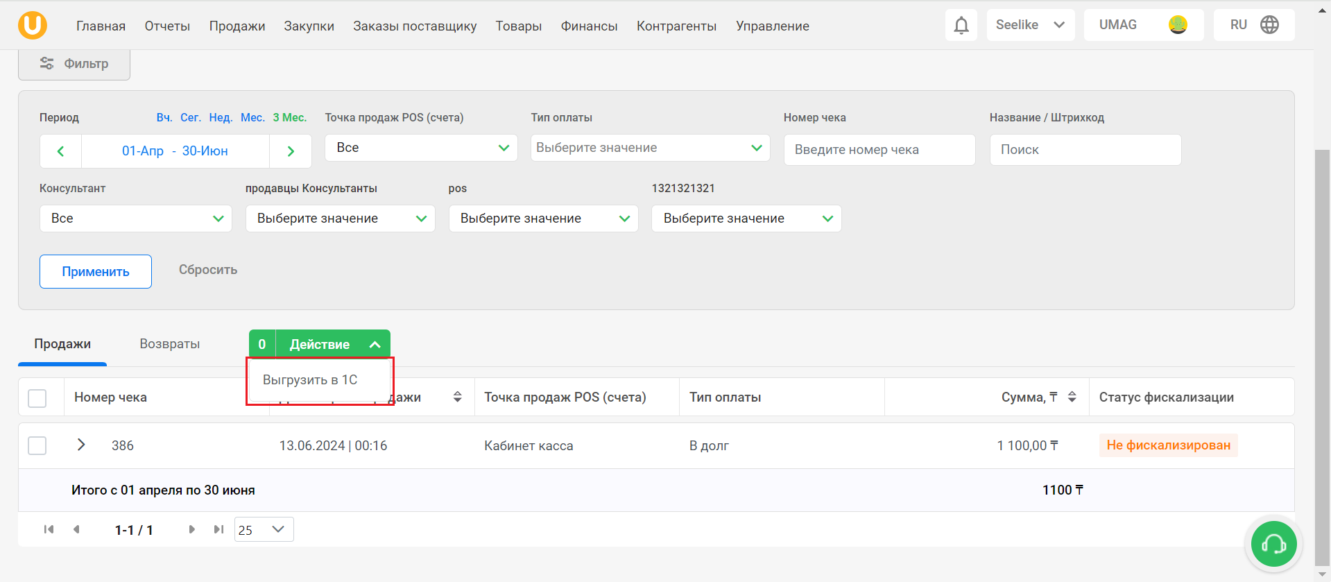 Также для вашего удобства представлена возможность выгрузки данных на платформу 1С,для этого нажмите на кнопку “Действие” и затем в выпадающем списке выберите“Выгрузить в 1С”. См. инструкцию “Обмен данными с 1С”.