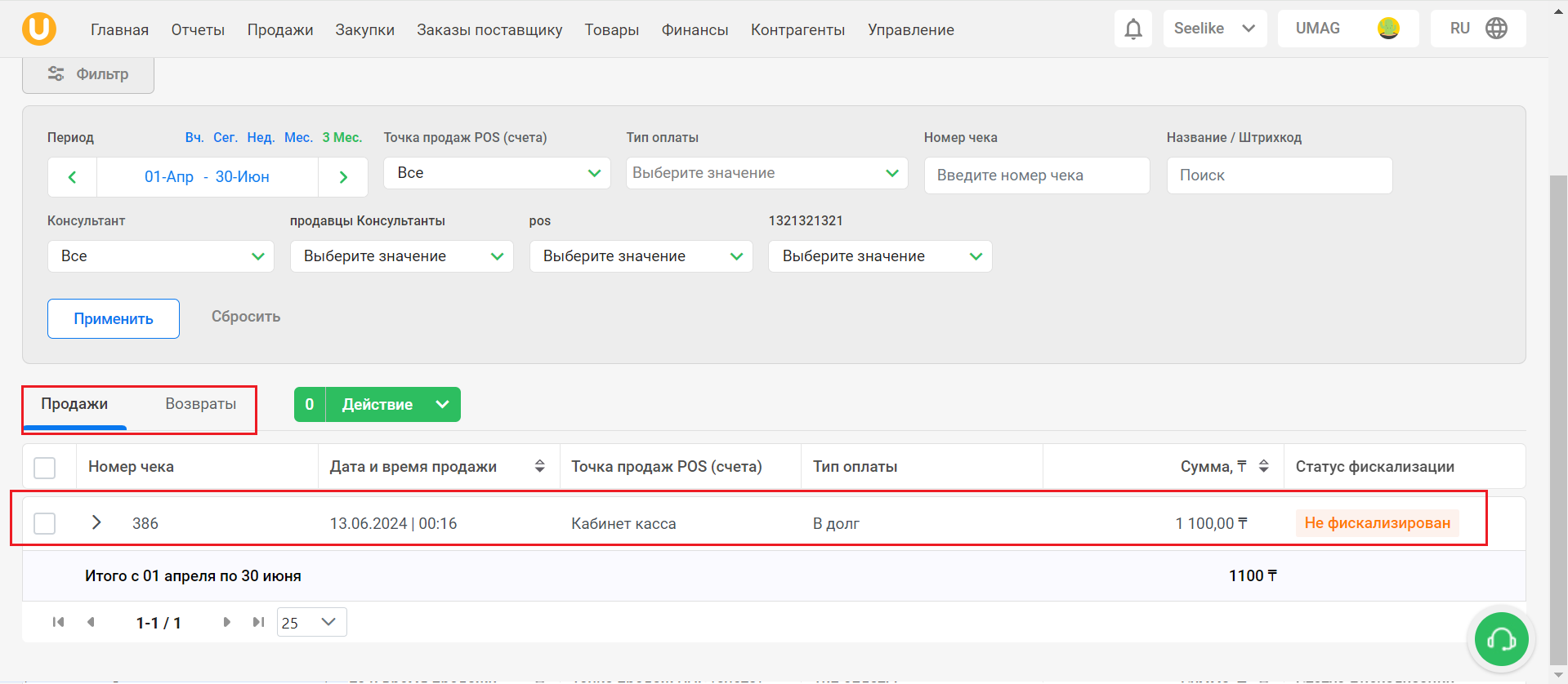 Вы можете выбрать вкладку "Продажи" или "Возвраты", чтобы просмотреть информацию только в разрезе продаж или возвратов.Далее вы увидите статистику продаж в разрезе чеков, отображающую следующие столбцы: номер чека, дата и время продажи, точка продажи POS, тип оплаты, сумма и статус фискализации.Эти данные позволяют не только отслеживать общие объемы продаж и понимать предпочтения покупателей в выборе способа оплаты, но и обеспечивают основу для анализа эффективности вашего бизнеса. При необходимости вы можете дополнительно изучать информацию о конкретных товарах, включенных в каждый чек, нажав на соответствующую строку и получив детализацию о составе продажи.