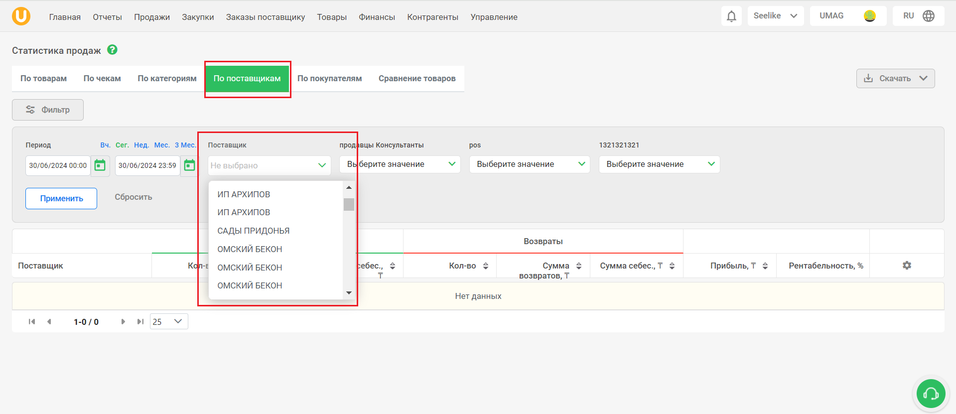 Для просмотра статистики продаж по определенным поставщикам нажмите на поле поставщик и выберите интересующего вас контрагента в выпадающем списке.