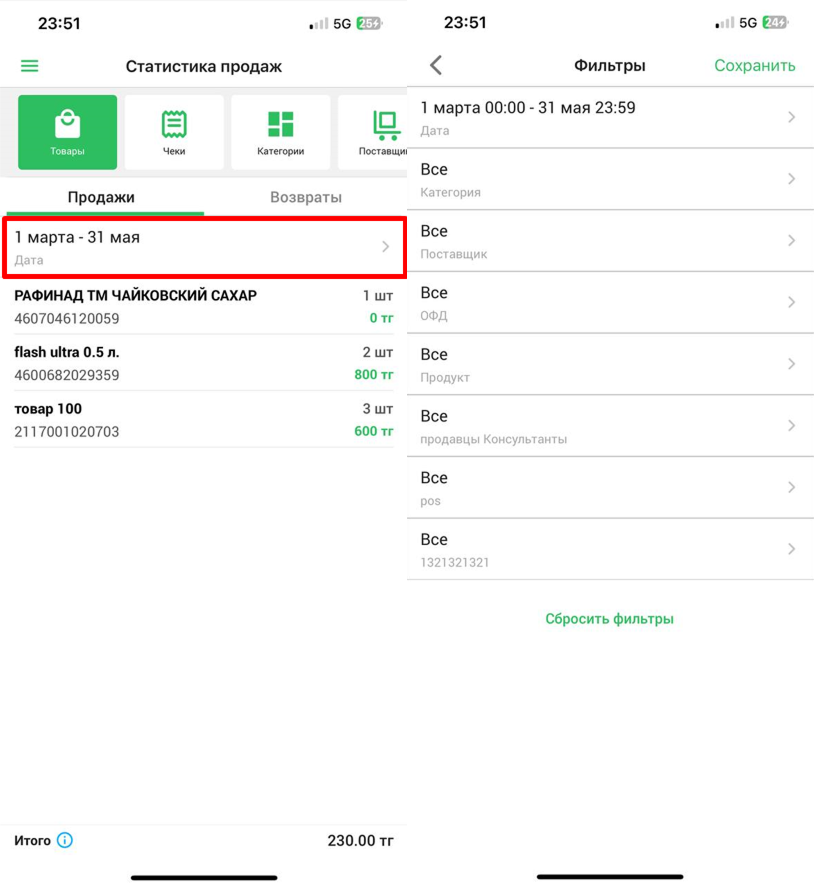 Для просмотра статистики продаж по различным критериям, таким как период,поставщик или точка продаж, просто нажмите кнопку 'Фильтр' в левом верхнем углу.