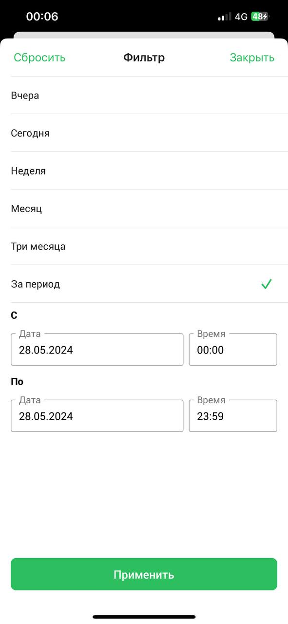 Вы можете выбрать период с помощью календаря. Выберите период - начальную и конечную даты, или используйте быстрые варианты: вчера, сегодня, неделя, месяц и 3 месяца.