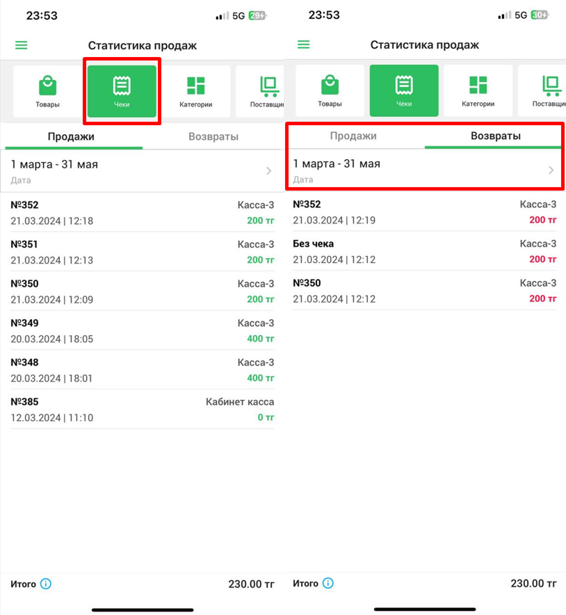 Перейдите на вкладку "Чеки", чтобы увидеть основные данные о чеках. Вы можете выбрать вкладку "Продажи" или "Возвраты", чтобы просмотреть соответствующую информацию.