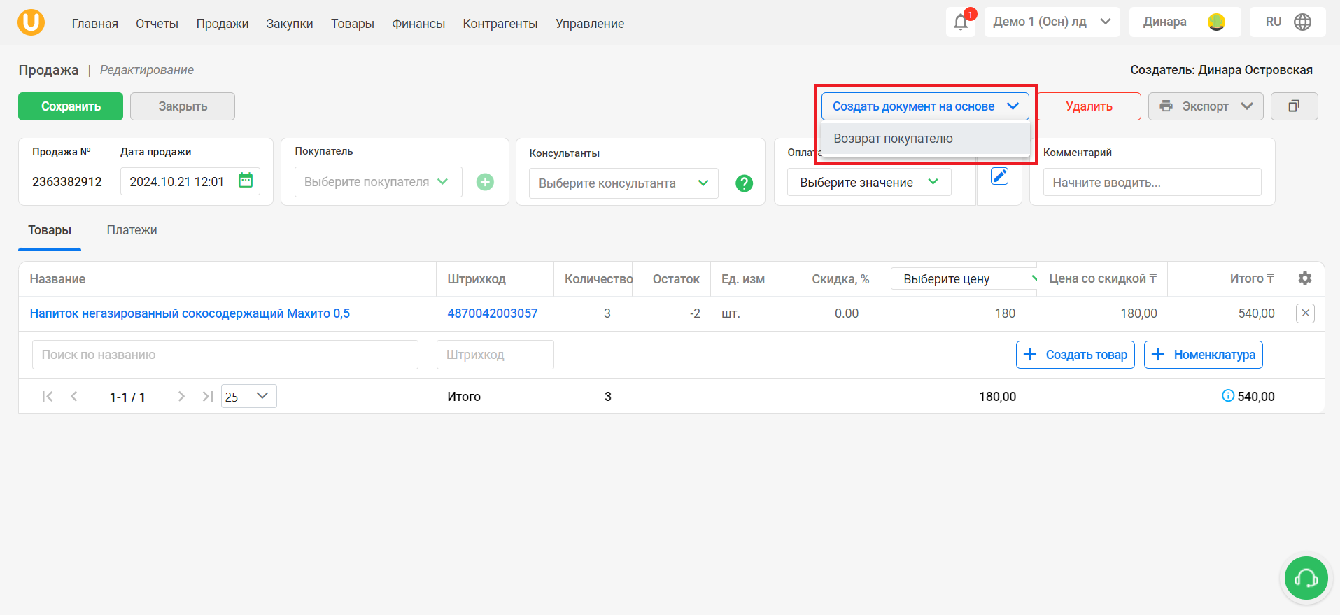 Нажмите на выпадающий список “Создать документ на основе”, выберите “Возврат покупателю”. Это перенаправит вас на страницу оформления возврата покупателя.