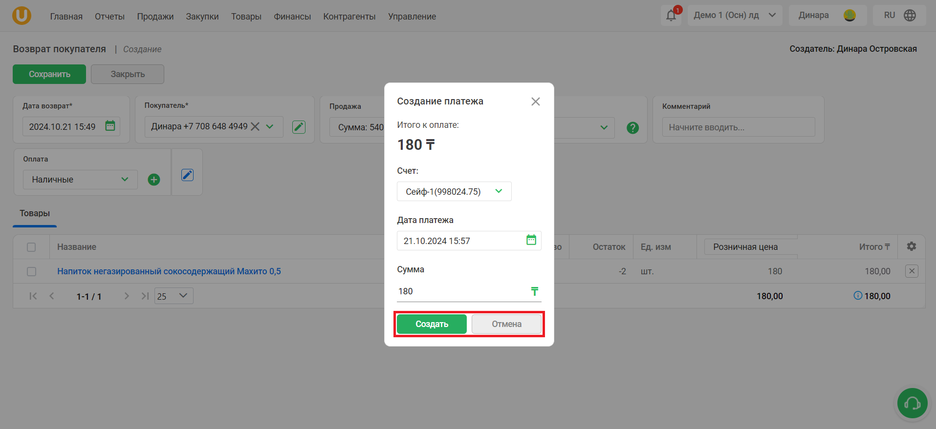 Завершите оформление возврата, нажав кнопку "Создать".