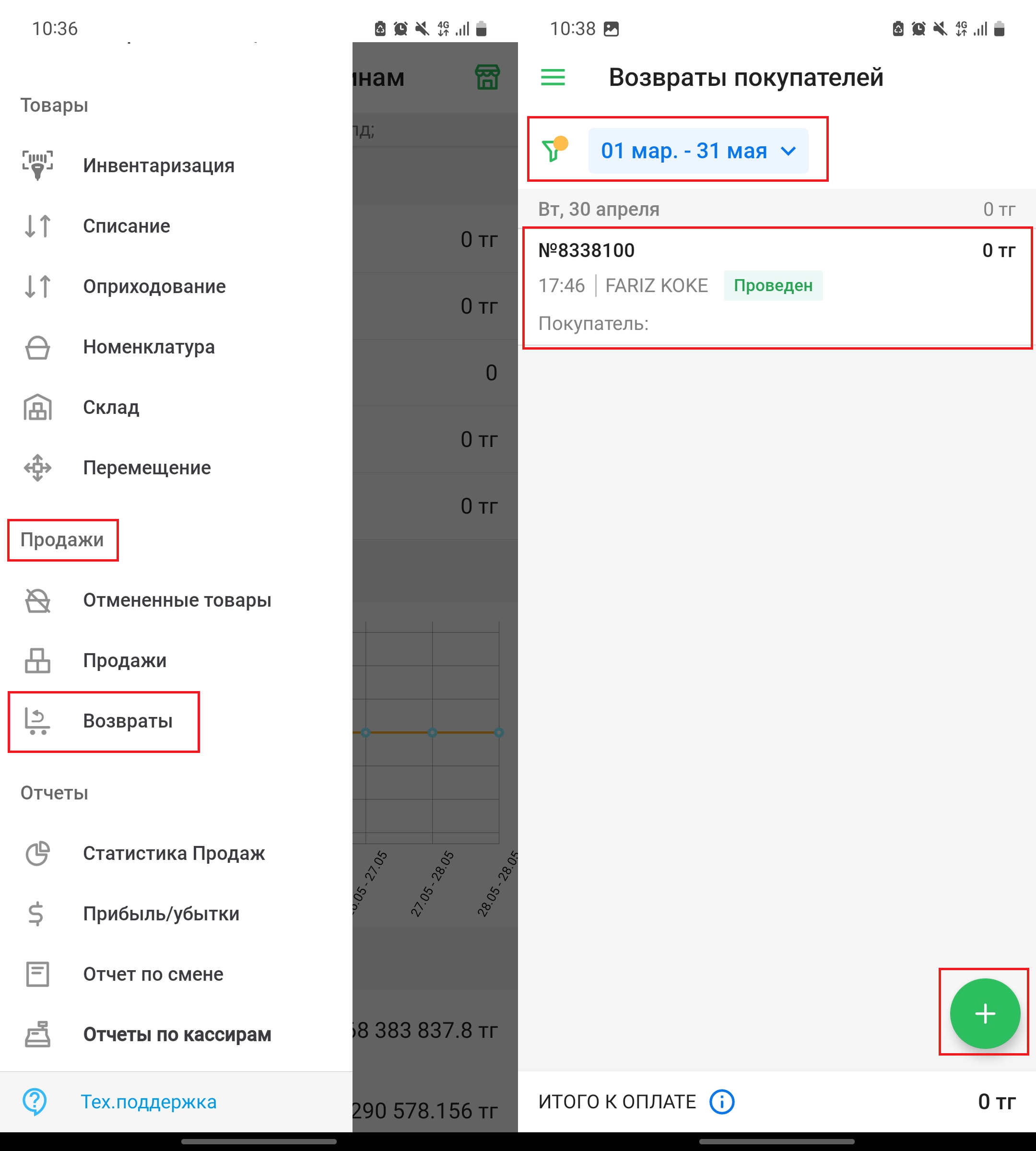 Далее, на странице возврата покупателей нажмите кнопку “➕Возврат” в левом верхнем углу страницы.