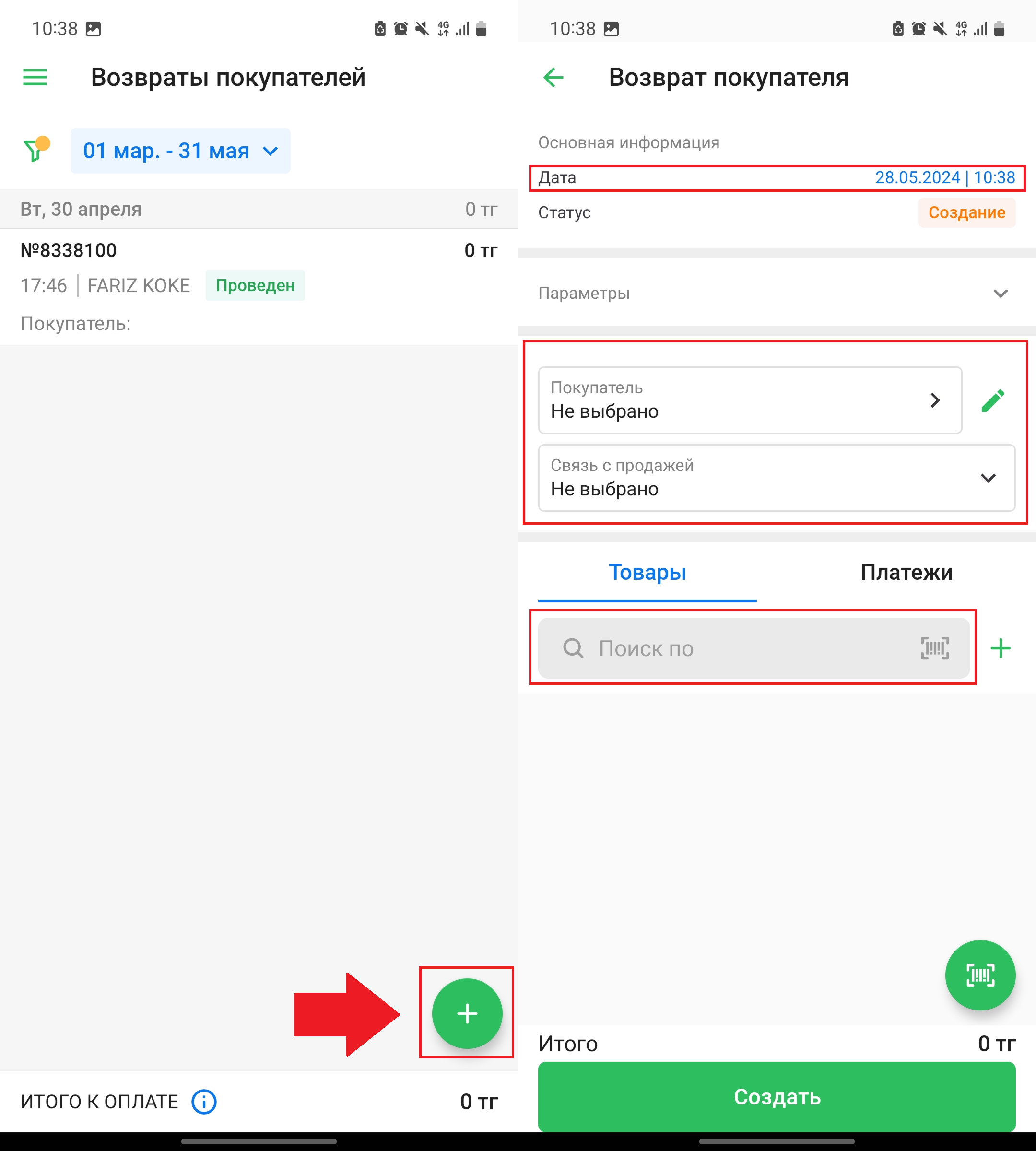 Нажмите на кнопку “➕” во вкладке “Товары”, чтобы создать новый товар и добавить его в возврат.