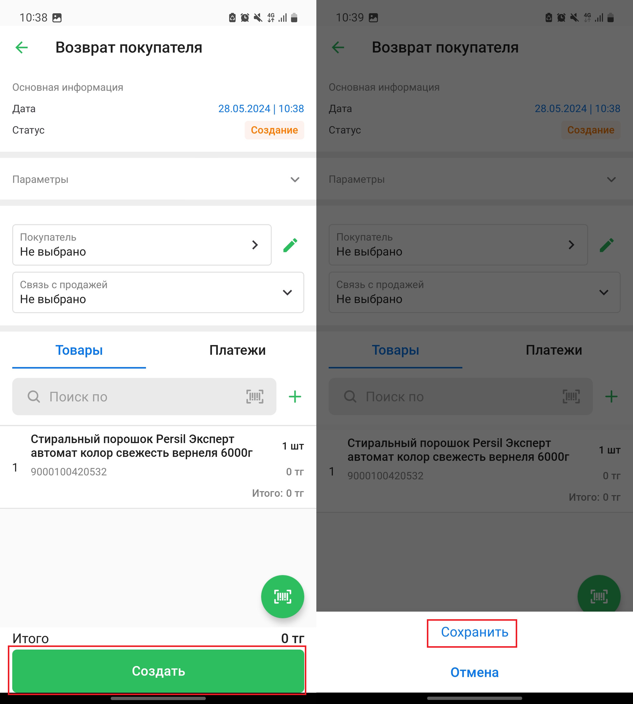 Добавленные в возврат товары вы увидите в списке во вкладке “Товары”. При необходимости, укажите дополнительные данные во вкладке “Параметры”. Нажмите на кнопку “Создать” в нижней части экрана, затем нажмите на кнопку “Сохранить”, чтобы провести возврат товаров.