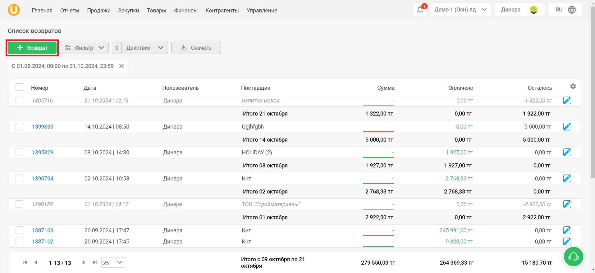 Нажмите на кнопку “📥Скачать”, чтобы скачать список возвратов.