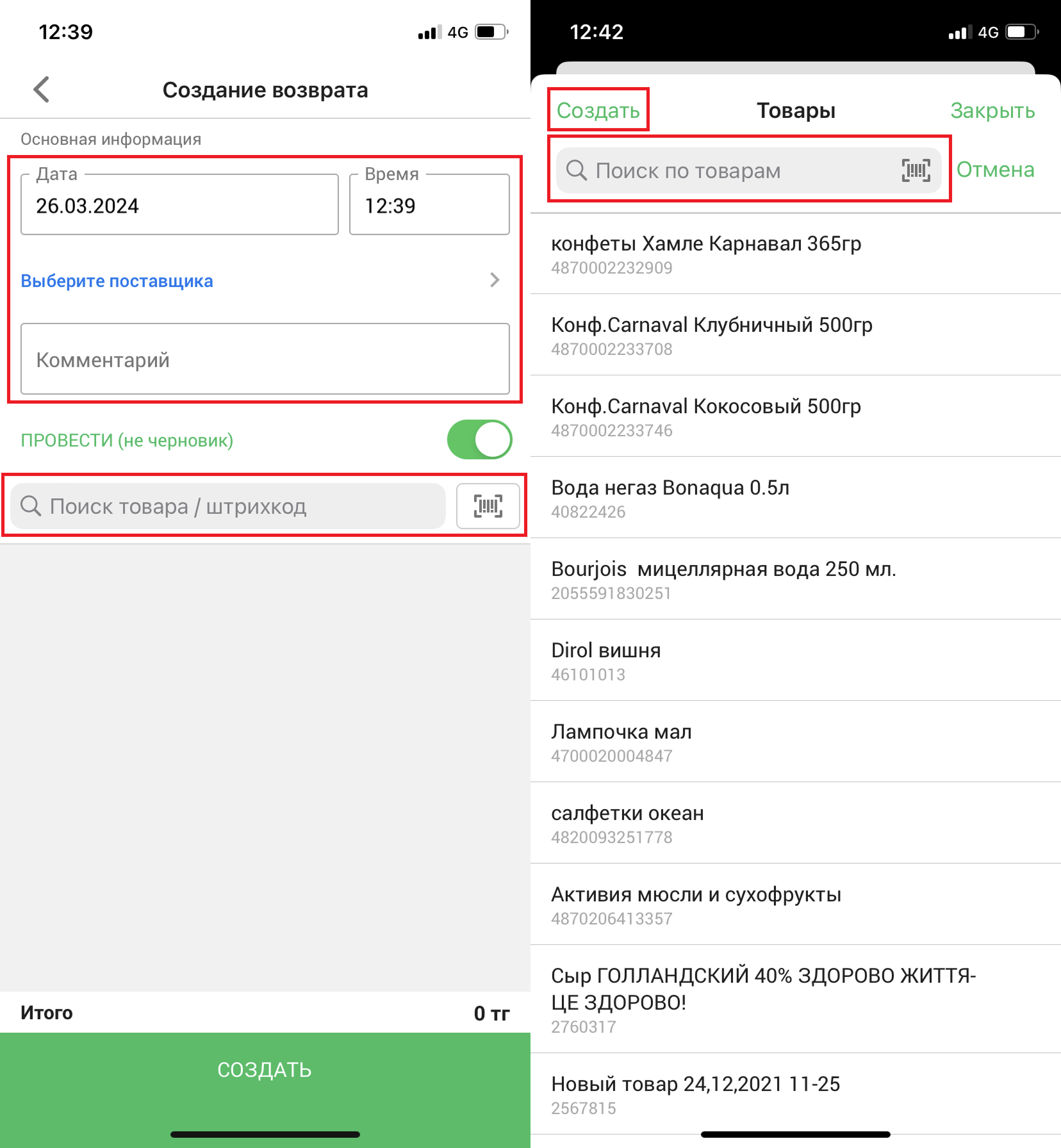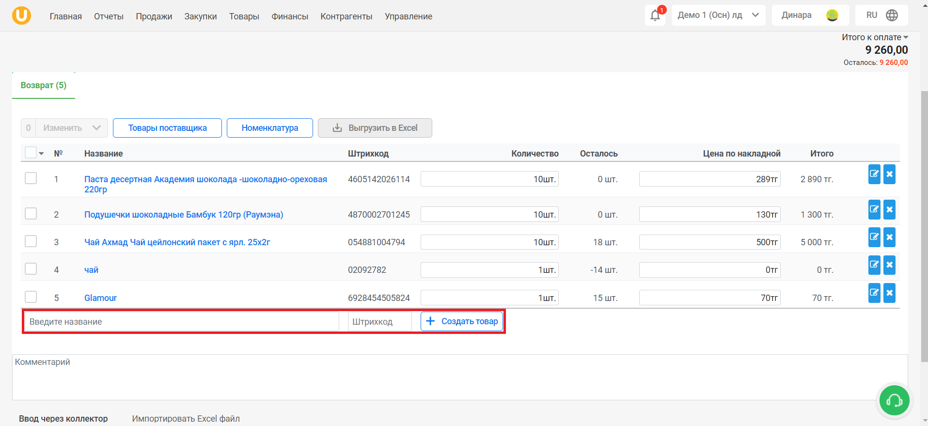Также, вы можете добавить товары, воспользовавшись полями поиска по названию/штрихкоду, либо создать новый товар, нажав на кнопку “Создать товар”.