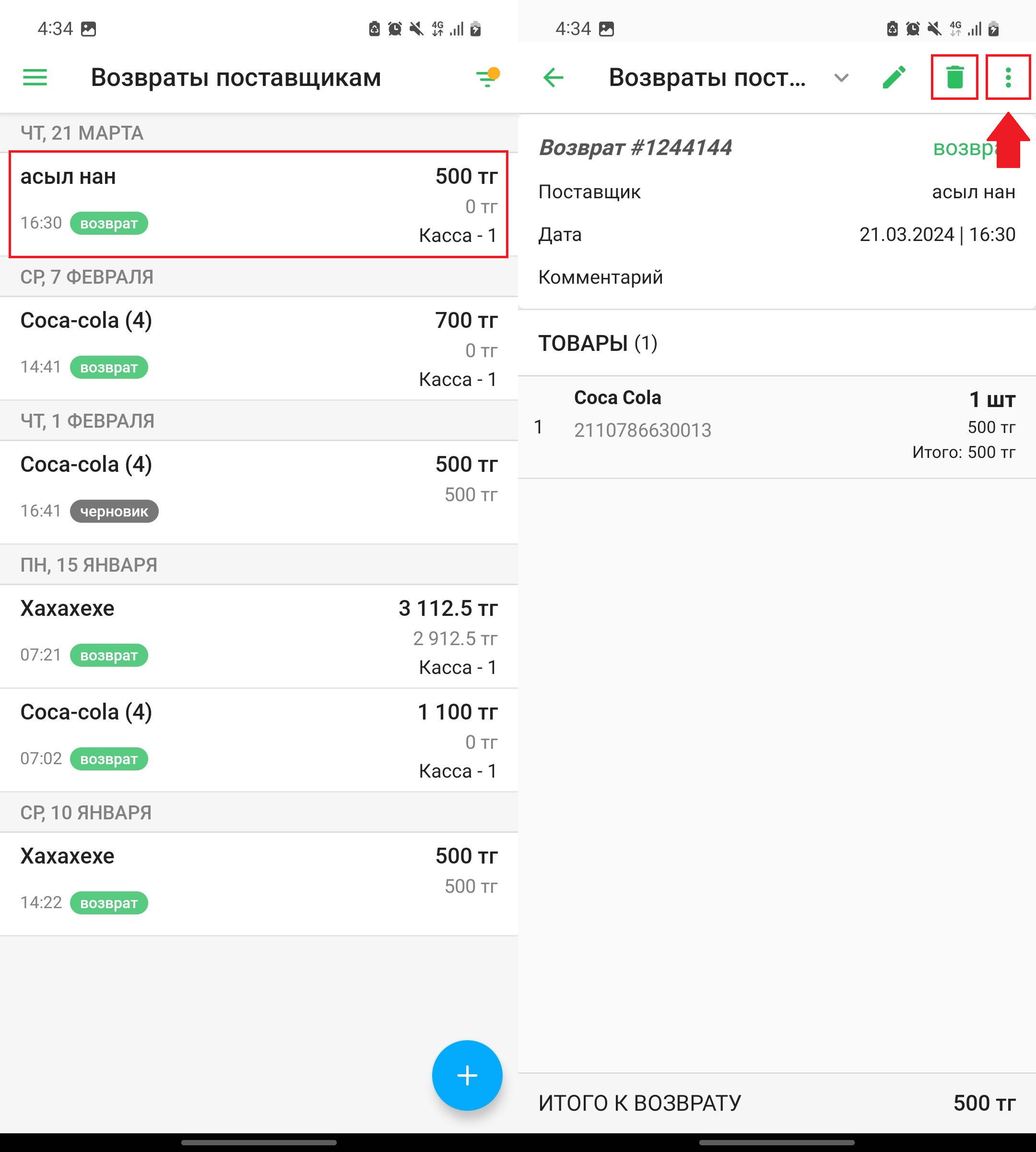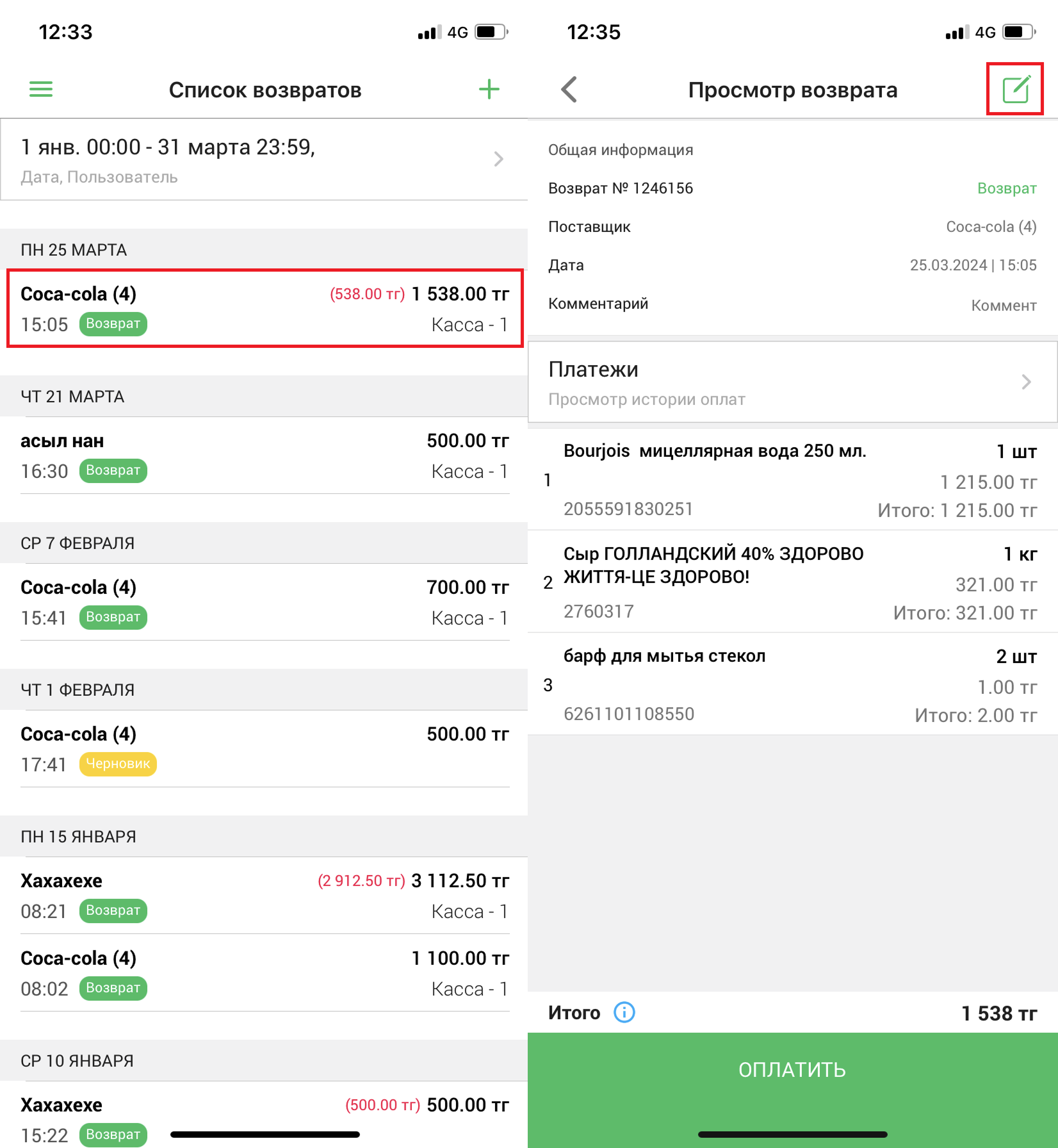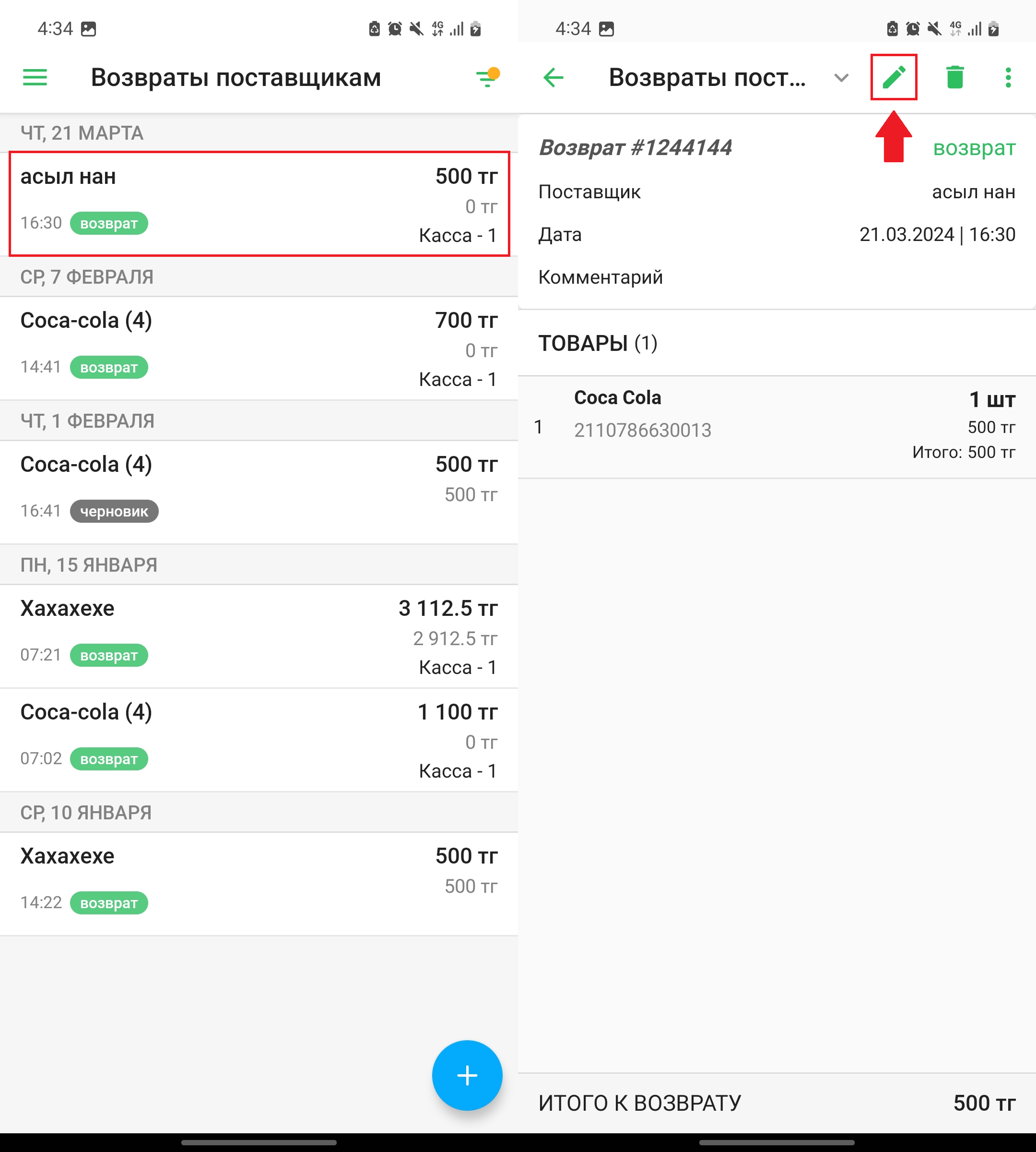 Выберите возврат из списка и нажмите на кнопку “📝” в правом верхнем углу экрана, чтобы отредактировать возврат.