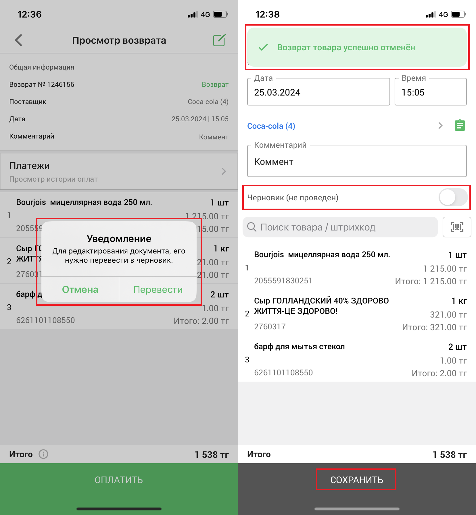 Откроется окно с уведомлением. Для редактирования возврата, необходимо перевести этот возврат в черновик. Нажмите на кнопку “Перевести”, чтобы перевести возврат в черновик, либо нажмите на кнопку “Отмена”, чтобы отменить действие. После, откроется страница “Редактирование возврата”, и вы увидите уведомление “Возврат товара успешно отменён”. Также, ползунок “ПРОВЕСТИ (не черновик)” будет в состоянии “Черновик (не проведен)”. Внесите необходимые изменения и нажмите на кнопку “Сохранить” в нижней части страницы.