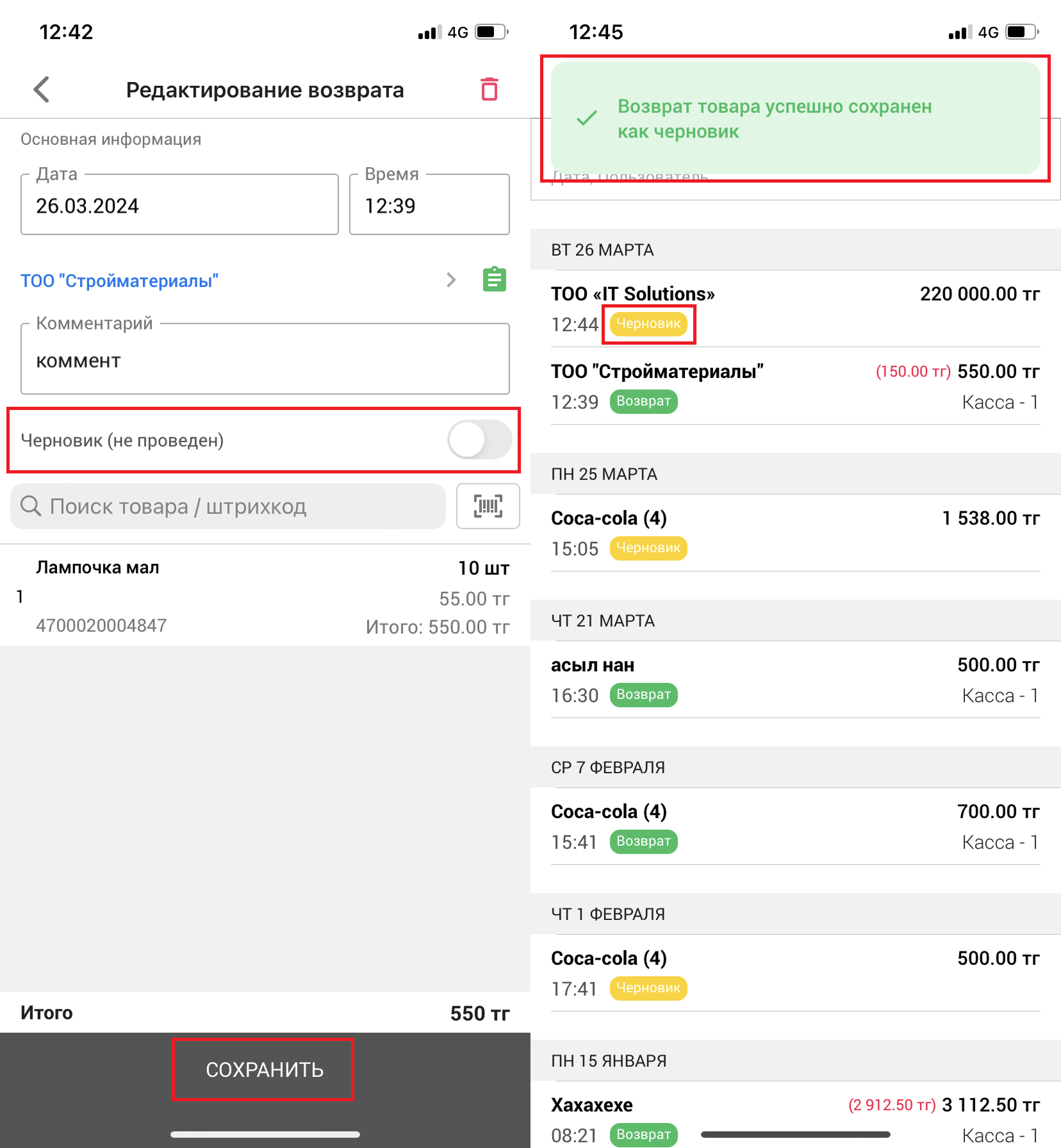 При успешном сохранении, мы увидим черновик возврата в списке. Сохраненные черновики в списке выделены серым цветом.