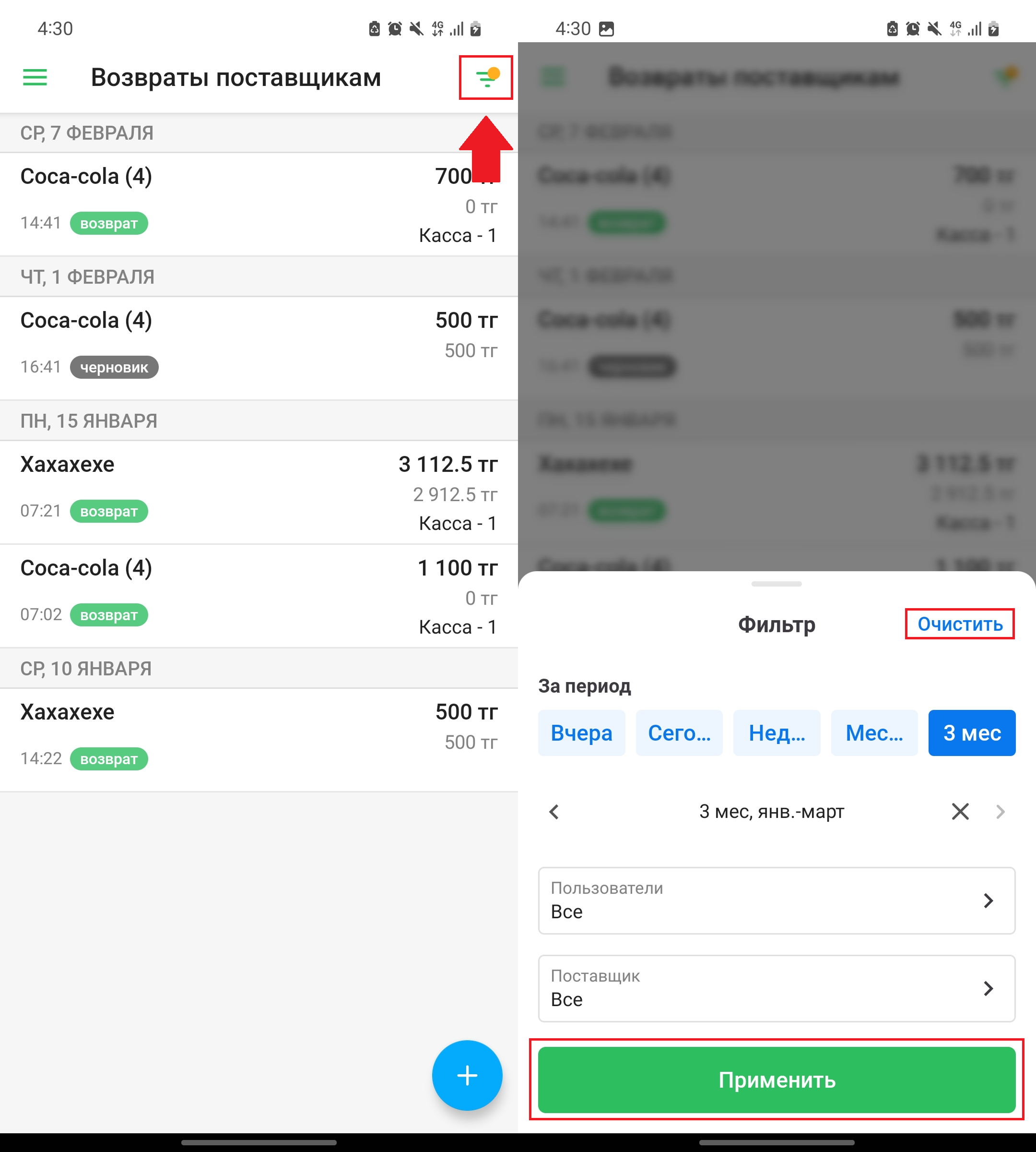 Нажмите на кнопку фильтра в правом верхнем углу экрана, чтобы отфильтровать список возвратов. Откроется окно “Фильтр”. Вы можете отфильтровать список по дате, по поставщику, и по пользователю, создавшему возврат. Нажмите на кнопку “Очистить” в правом верхнем углу окна, чтобы очистить фильтр, либо нажмите на кнопку “Применить” в правом верхнем углу, чтобы применить фильтр. Примененные фильтры вы увидите в верхней части страницы.