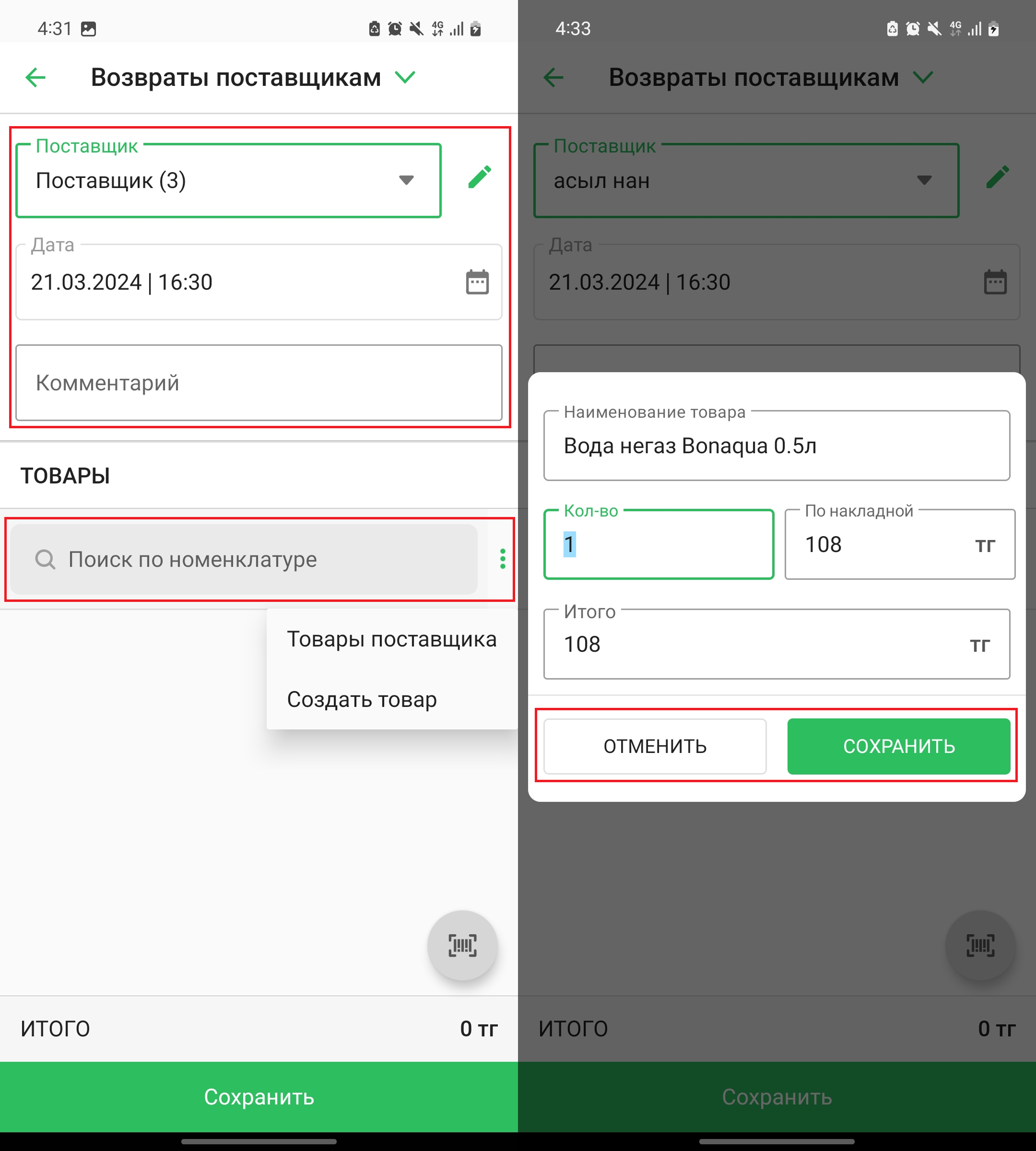 Откроется страница “Возврат поставщику (создание)”. Назначьте время возврата, выберите поставщика, нажав на соответствующие поля в верхней части страницы. Теперь, добавьте товары для возврата. Для этого, воспользуйтесь полем “Поиск по номенклатуре”. Также, вы можете создать новый товар, либо выбрать товар из списка товаров поставщика, нажав на три точки напротив поля поиска. После того, как вы выбрали товар, откроется окно добавления товара. Заполните все поля и нажмите на кнопку “Сохранить”, чтобы сохранить изменения, либо нажмите на кнопку “Отменить”, чтобы отменить действие.