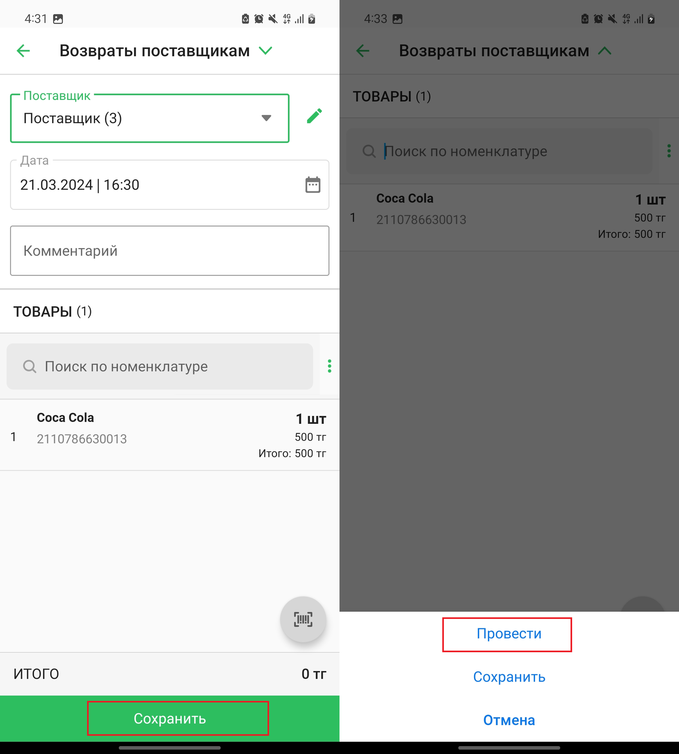 После внесения всех изменений, нажмите на кнопку “Сохранить” в нижней части страницы, чтобы провести возврат. В открывшемся меню выберите “Провести”, чтобы провести возврат товара поставщику, либо нажмите на “Сохранить”, чтобы сохранить возврат как черновик.
