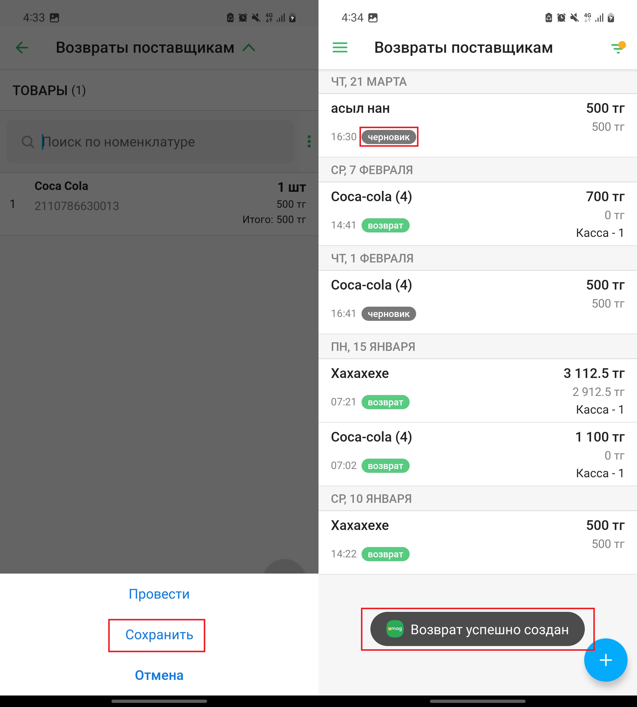 Нажмите на кнопку “Сохранить”, чтобы сохранить возврат как черновик.